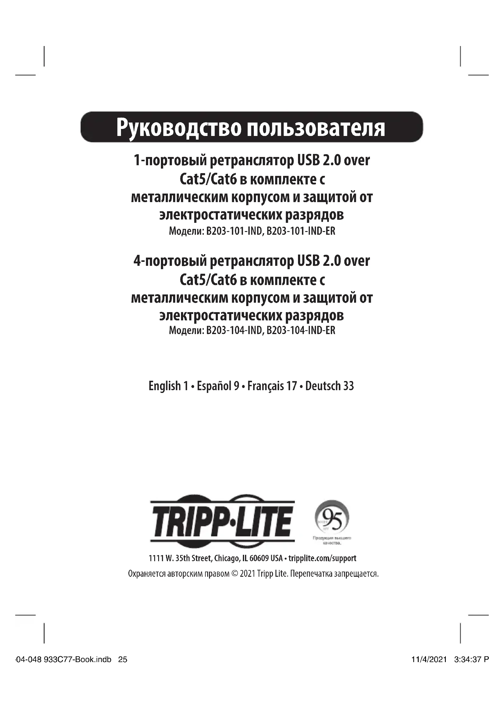От -20 до 70°C Размеры передатчика [В x Ш x Г] 27 x 115 x 62,4 мм Размеры приемника [В x Ш x Г] 27 x 115 x 62,4 мм 20-04-048 933C77-Book.indb 3020-04-048 933C77-Book.indb 30 11/4/2021 3:34:37 PM11/4/2021 3:34:37 PM31 Гарантийные обязательства Ограниченная гарантия сроком 1 год Компания Tripp Lite гарантирует отсутствие дефектов материалов и изготовления в течение одного (1) года с момента первоначальной покупки. Обязательства компании Tripp Lite по настоящей гарантии ограничиваются ремонтом или заменой (по ее единоличному усмотрению) любых таких дефектных изделий. Для получения услуг по данной гарантии необходимо получить номер Returned Material Authorization (RМА ― разрешение на возврат материалов) от компании Тripp Lite или ее авторизованного сервисного центра. Изделия должны быть возвращены в компанию Tripp Lite или ее авторизованный сервисный центр с предоплатой транспортных расходов и сопровождаться кратким описанием возникшей проблемы и документом, подтверждающим дату и место его приобретения. Действие настоящей гарантии не распространяется на оборудование, поврежденное в результате аварии, небрежного обращения или неправильного использования, а также видоизмененное каким бы то ни было образом.