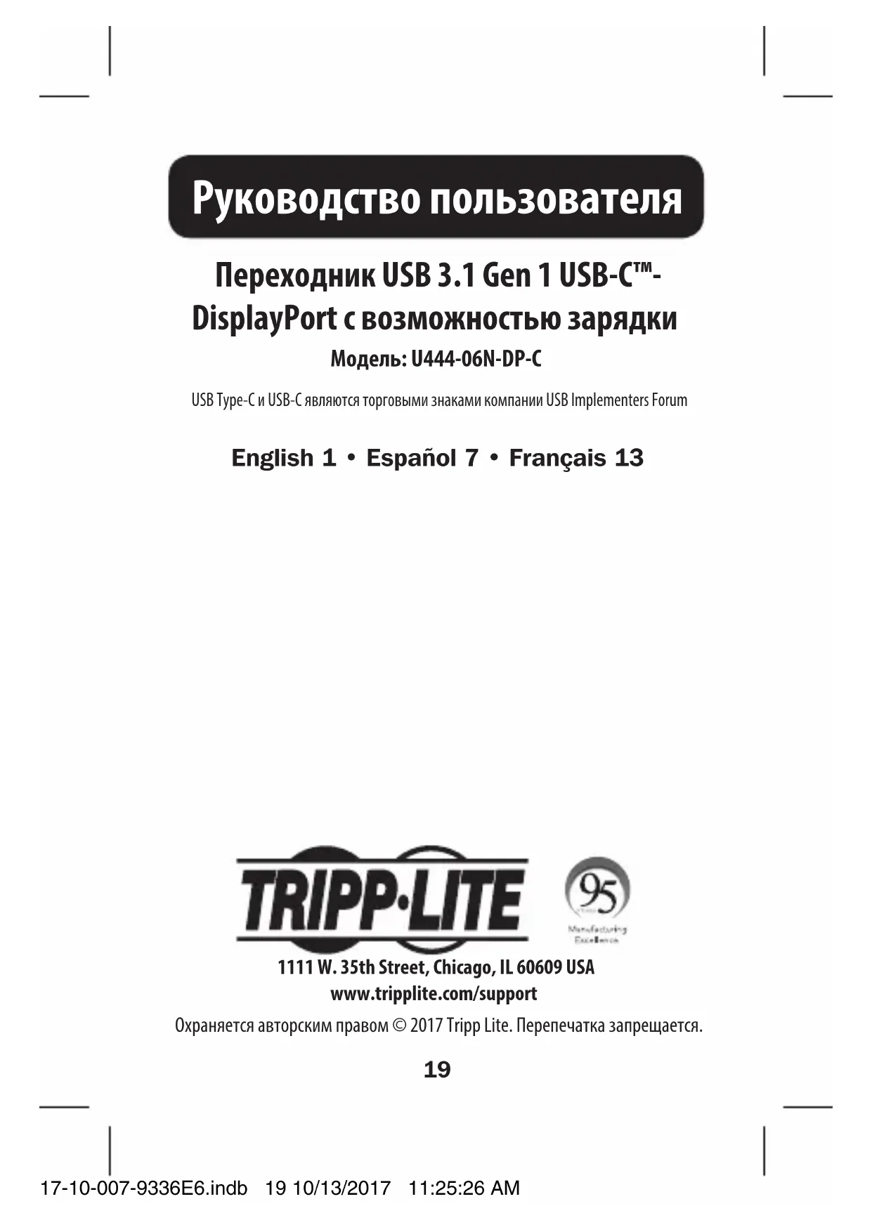 От -10 до 70°C Влажность при хранении Относительная влажность от 5 до 90%, без образования конденсата Требования к электропитанию Порт для зарядки USB-C PD Поддерживает входное питание до 20 В / 3 А (60 Вт) Технические характеристики 17-10-007-9336E6.indb 22 10/13/2017 11:25:26 AM23 Гарантийные обязательства ОГРАНИЧЕННАЯ ГАРАНТИЯ 3 ГОД Компания TRIPP LITE гарантирует отсутствие дефектов материалов и изготовления в течение три (3) года с момента первоначальной покупки. Обязательства компании TRIPP LITE по настоящей гарантии ограничиваются ремонтом или заменой (по ее единоличному усмотрению) любых таких дефектных изделий. Для получения услуг по данной гарантии необходимо получить номер Returned Material Authorization (RMA - разрешение на возврат материалов) от компании TRIPP LITE или ее авторизованного сервисного центра. Изделия должны быть возвращены в компанию TRIPP LITE или авторизованный сервисный центр TRIPP LITE с предоплатой транспортных расходов и сопровождаться кратким описанием возникшей проблемы и документом, подтверждающим дату и место его приобретения. Действие настоящей гарантии не распространяется на оборудование, поврежденное в результате аварии, небрежного обращения или неправильного использования, а также видоизмененное каким бы то ни было образом. ЗА ИСКЛЮЧЕНИЕМ ПРЕДУСМОТРЕННЫХ ЗДЕСЬ СЛУЧАЕВ КОМПАНИЯ TRIPP LITE НЕ ПРЕДОСТАВЛЯЕТ КАКИХ-ЛИБО ЯВНЫХ ИЛИ ПОДРАЗУМЕВАЕМЫХ ГАРАНТИЙ, ВКЛЮЧАЯ ГАРАНТИИ КОММЕРЧЕСКОЙ ПРИГОДНОСТИ И ПРИГОДНОСТИ ДЛЯ КАКОЙ-ЛИБО КОНКРЕТНОЙ