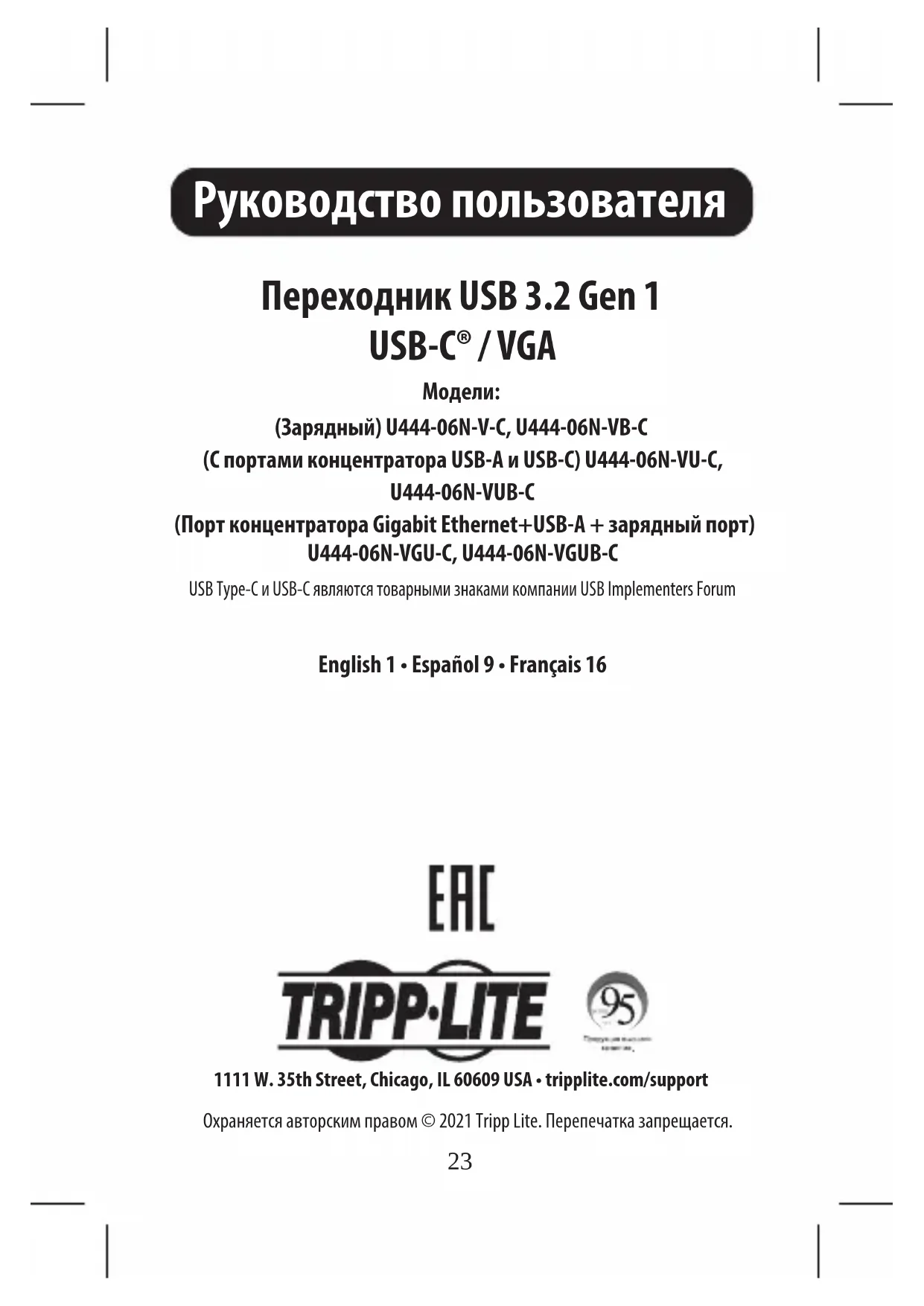 USB Type-C и USB-C являются товарными знаками компании USB Implementers Forum 1111 W. 35th Street, Chicago, IL 60609 USA • tripplite.com/support Охраняется авторским правом © 2021 Tripp Lite. Перепечатка запрещается. English 1 • Español 9 • Français 1624 Комплект поставки Характеристики продукта