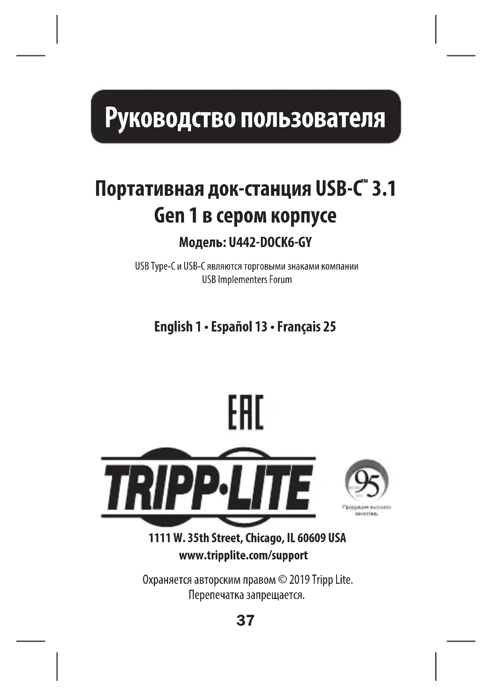 Gen 1 в сером корпусе Модель: U442-DOCK6-GY USB Type-C и USB-C являются торговыми знаками компании USB Implementers Forum 1111 W. 35th Street, Chicago, IL 60609 USA www.tripplite.com/support Охраняется авторским правом © 2019 Tripp Lite. Перепечатка запрещается. English 1 • Español 13 • Français 2538 Характеристики изделия
