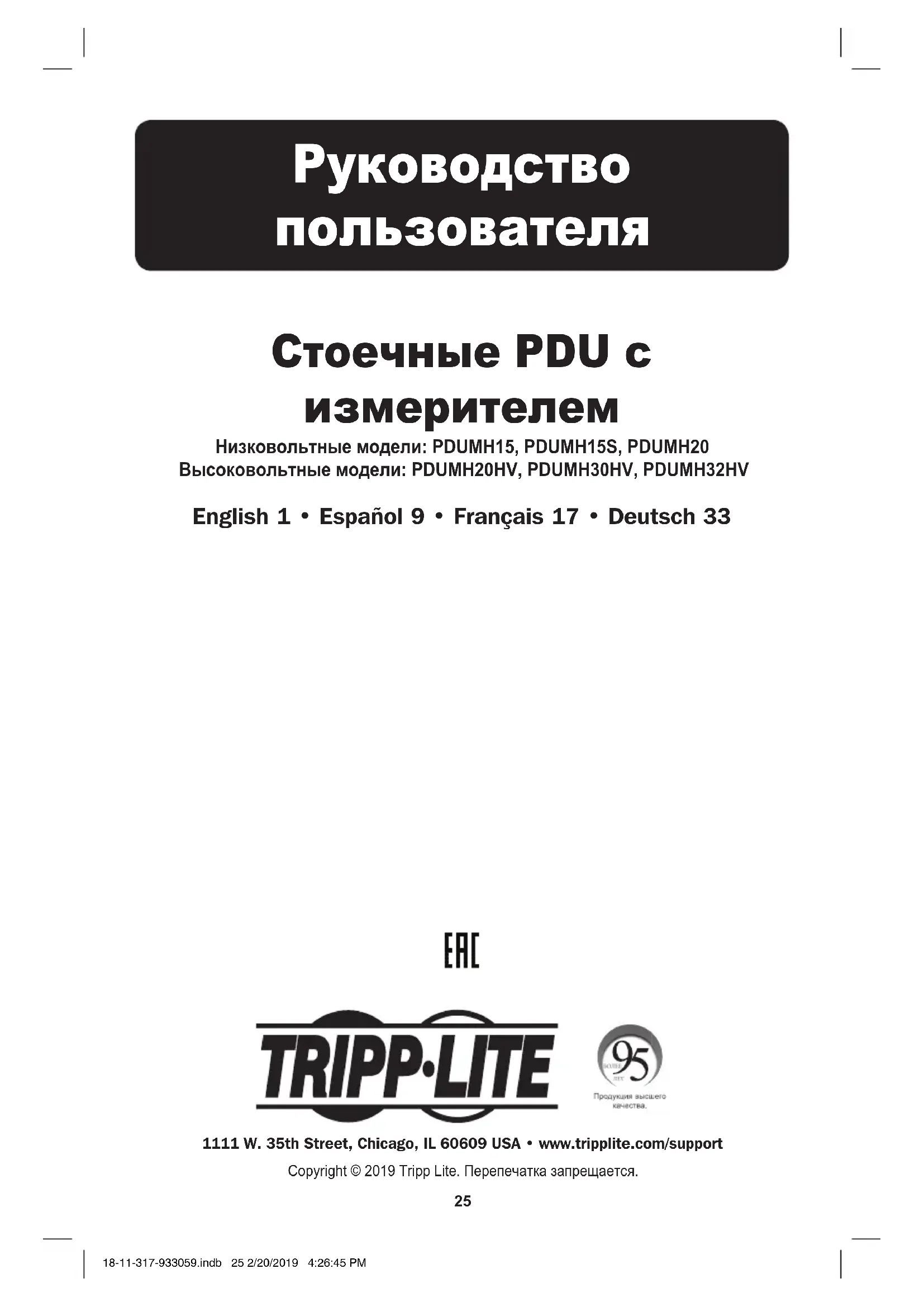 - Renvoyer le matériel neuf pour recyclage quand ceci devient éventuellement un rebut La politique de Tripp Lite en est une d’amélioration continue. Les spécifications sont sujettes à changement sans préavis. 1111 W. 35th Street, Chicago, IL 60609 USA • www.tripplite.com/support 18-11-317 93-3059_revF 18-11-317-933059.indb 24 2/20/2019 4:26:45 PM25 Руководство пользователя Стоечные PDU с измерителем Низковольтные модели: PDUMH15, PDUMH15S, PDUMH20 Высоковольтные модели: PDUMH20HV, PDUMH30HV, PDUMH32HV English 1 • Español 9 • Français 17 • Deutsch 33 1111 W. 35th Street, Chicago, IL 60609 USA • www.tripplite.com/support Copyright © 2019 Tripp Lite. Перепечатка запрещается. 18-11-317-933059.indb 25 2/20/2019 4:26:45 PM26 СОХРАНИТЕ НАСТОЯЩИЕ УКАЗАНИЯ В настоящем руководстве содержатся указания и предупреждения, которые необходимо соблюдать в процессе установки, эксплуатации и хранения данного изделия. Игнорирование этих указаний и предупреждений может привести к потере гарантии на изделие. Важные предупреждения