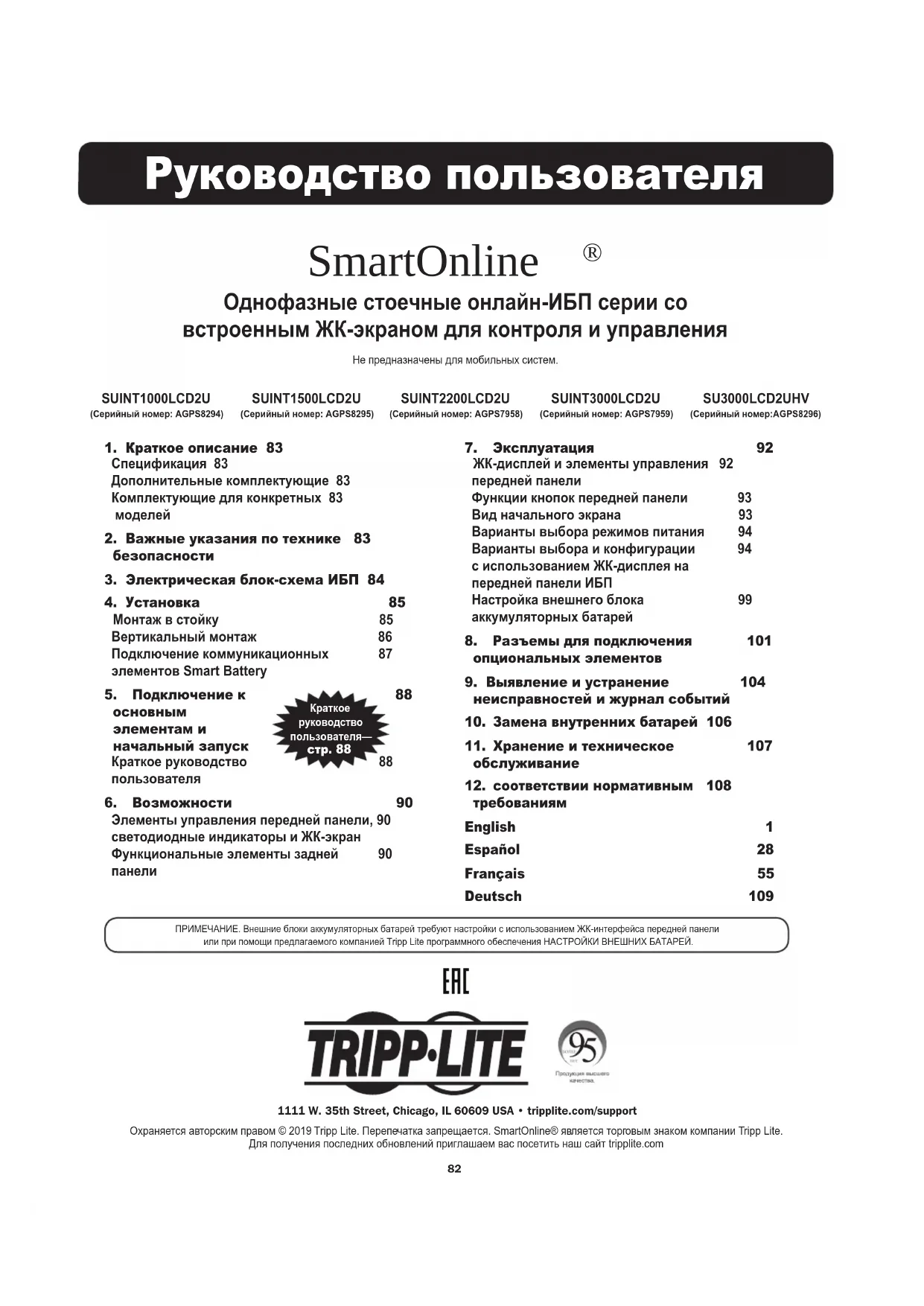 требованиям English 1 Español 28 Français 55 Deutsch 109 ПРИМЕЧАНИЕ. Внешние блоки аккумуляторных батарей требуют настройки с использованием ЖК-интерфейса передней панели или при помощи предлагаемого компанией Tripp Lite программного обеспечения НАСТРОЙКИ ВНЕШНИХ БАТАРЕЙ.1111 W. 35th Street, Chicago, IL 60609 USA • tripplite.com/support Охраняется авторским правом © 2019 Tripp Lite. Перепечатка запрещается. SmartOnline® является торговым знаком компании Tripp Lite. Для получения последних обновлений приглашаем вас посетить наш сайт tripplite.comOwner’s ManualOwner’s Manual