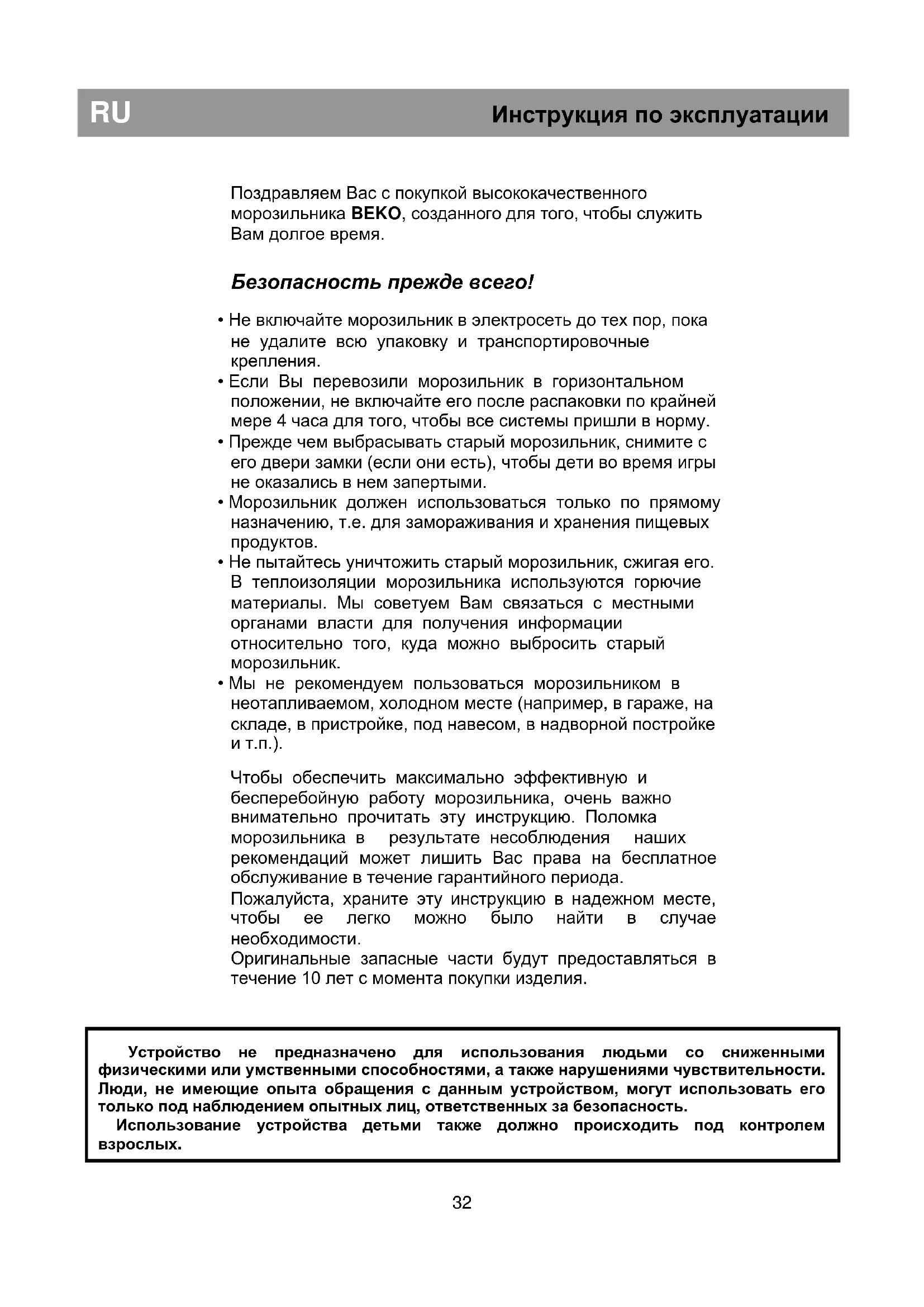 Устройство не предназначено для использования людьми со сниженными физическими или умственными способностями, а также нарушениями чувствительности. Люди, не имеющие опыта обращения с данным устройством, могут использовать его только под наблюдением опытных лиц, ответственных за безопасность. Использование устройства детьми также должно происходить под контролем взрослых.RU Инструкция по эксплуатации Требования к электропитанию Перед тем как вставить штепсель в электрическую розетку, убедитесь, что напряжение и частота тока, указанные на заводской марке внутри морозильника, соответствуют напряжению и частоте тока в электросети Вашего дома. Мы рекомендуем подключать морозильник к электросети через розетку, должным образом установленную в легко доступном месте. После установки вилка должна быть легкодоступна, чтобы устройство можно было легко отсоединять от сети питания. Внимание! Морозильник должен быть