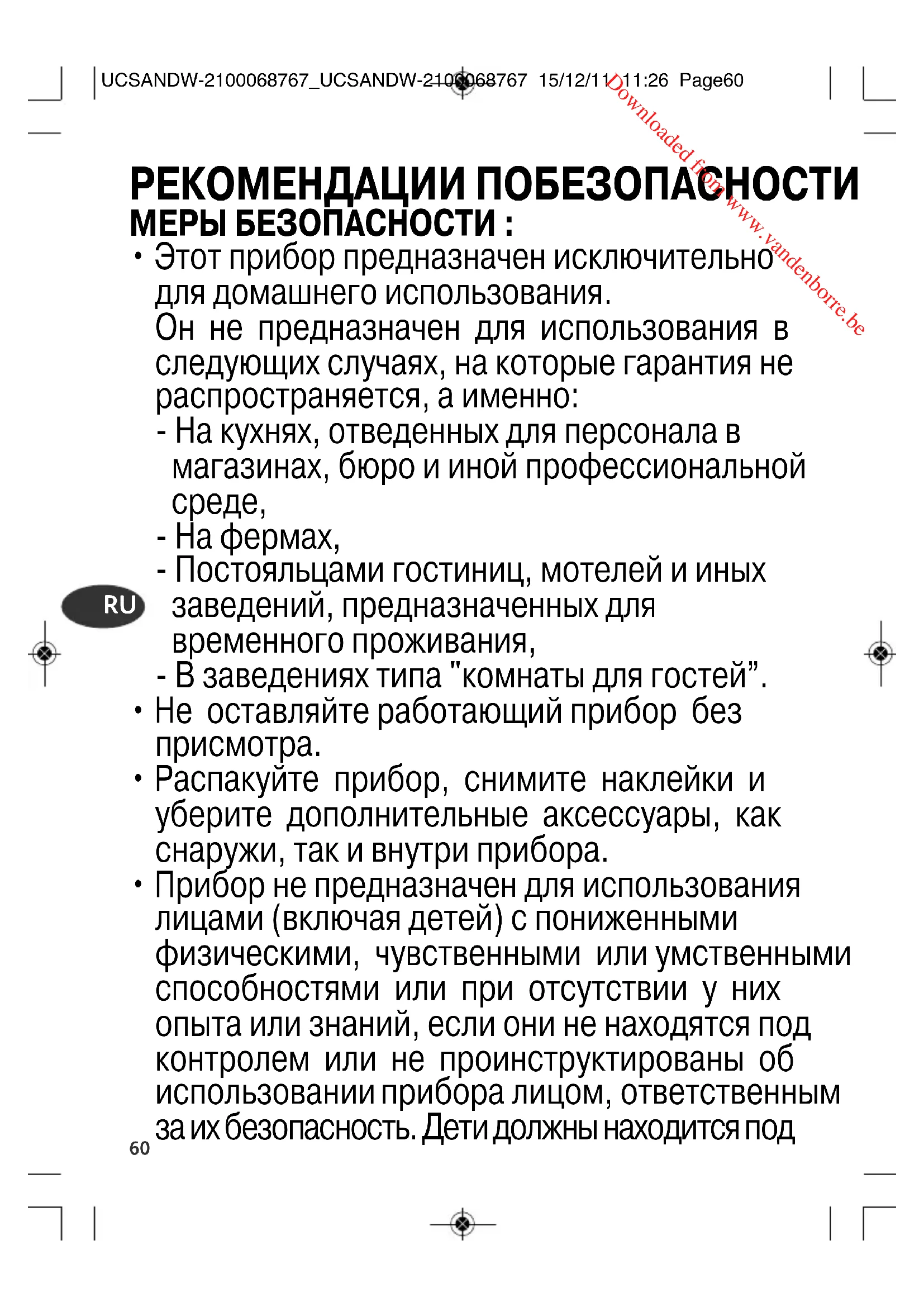 UCSANDW-2100068767_UCSANDW-2100068767 15/12/11 11:26 Page62 Downloaded from www.vandenborre.be• Благодарим вас за то, что вы предпочли наше изделие и просим вас внимательно прочитать и сохранить рекомендации, ко- торые относятся ко всем моделям этого прибора с учетом их комплектующих.