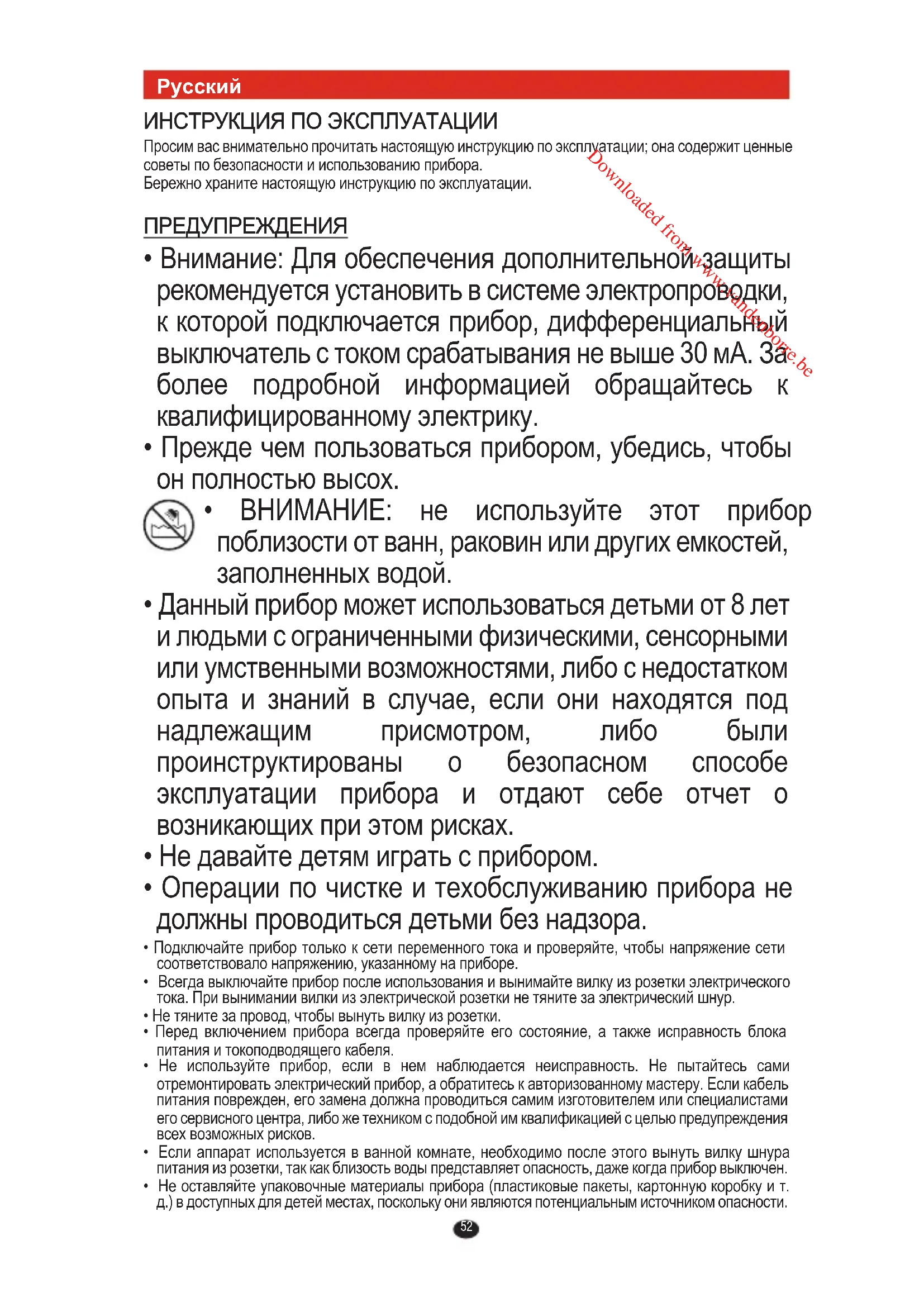 - ВНИМАНИЕ: не используйте этот прибор поблизости от ванн, раковин или других емкостей, заполненных водой.