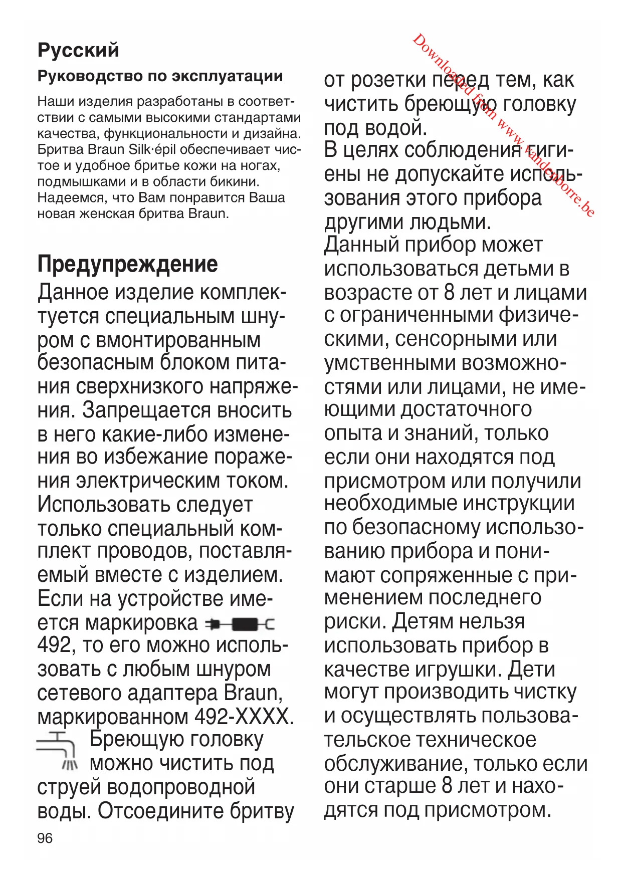 Для поддержания оптимальной емкости аккумуляторных батарей, бритву необходимо полностью разряжать (путем обычного использо- вания) примерно раз в 6 месяцев. После этого полностью зарядите бритву. Не подвергайте бритву воздействию температуры свыше 50 °C в течение длительного времени. ëÔˆËÙË͇ˆËË ÔÓ ˝ÎÂÍÚ˘ÂÒÚ‚Û – ÒÏ. ̇‰ÔËÒ¸ ̇ ÒÔˆˇθÌÓÏ ¯ÌÛÂ. Информация может быть изменена без предварительного уведомления. Продукт содержит аккумуляторы и/или перерабатываемые отходы электрического оборудования. В целях защиты окружающей среды не выбрасывайте изделие вместе с бытовыми отходами. Передайте его в пункты сбора отходов электрического оборудования в вашей