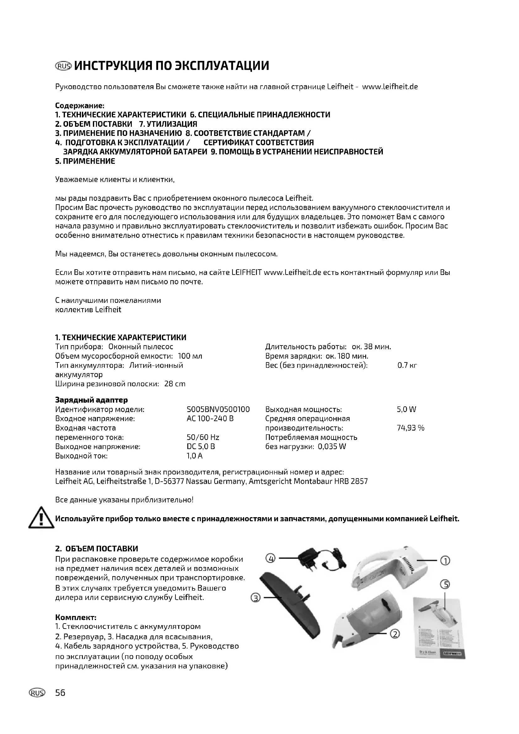 Название или товарный знак производителя, регистрационный номер и адрес: Leifheit AG, Leifheitstraße 1, D-56377 Nassau Germany, Amtsgericht Montabaur HRB 2857 Все данные указаны приблизительно! Используйте прибор только вместе с принадлежностями и запчастями, допущенными компанией Leifheit. Тип прибора: Оконный пылесос Объем мусоросборной емкости: 100 мл Тип аккумулятора: Литий-ионный аккумулятор Ширина резиновой полоски: 28 cm Длительность работы: ок. 38 мин. Время зарядки: ок. 180 мин. Вес (без принадлежностей): 0.7 кг Зарядный адаптер Идентификатор модели: S005BNV0500100 Входное напряжение: AC 100-240 В Входная частота переменного тока: 50/60 Hz Выходное напряжение: DC 5,0 В Выходной ток: 1,0 A Выходная мощность: 5,0 W Средняя операционная производительность: 74,93 % Потребляемая мощность без нагрузки: 0,035 W57 RUS