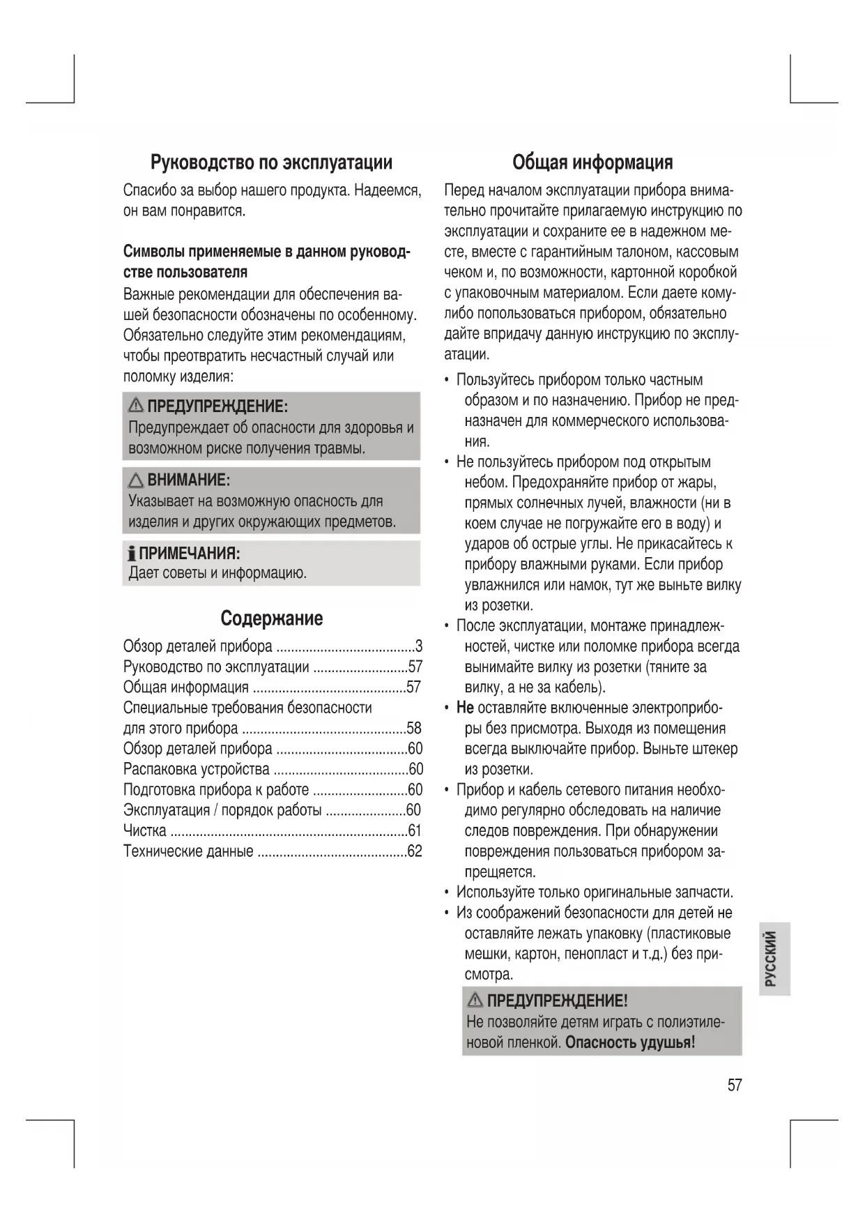 - Технические данные Общая информация Перед началом эксплуатации прибора внима- тельно прочитайте прилагаемую инструкцию по эксплуатации и сохраните ее в надежном ме- сте, вместе с гарантийным талоном, кассовым чеком и, по возможности, картонной коробкой с упаковочным материалом. Если даете кому- либо попользоваться прибором, обязательно дайте впридачу данную инструкцию по эксплу- p. 62