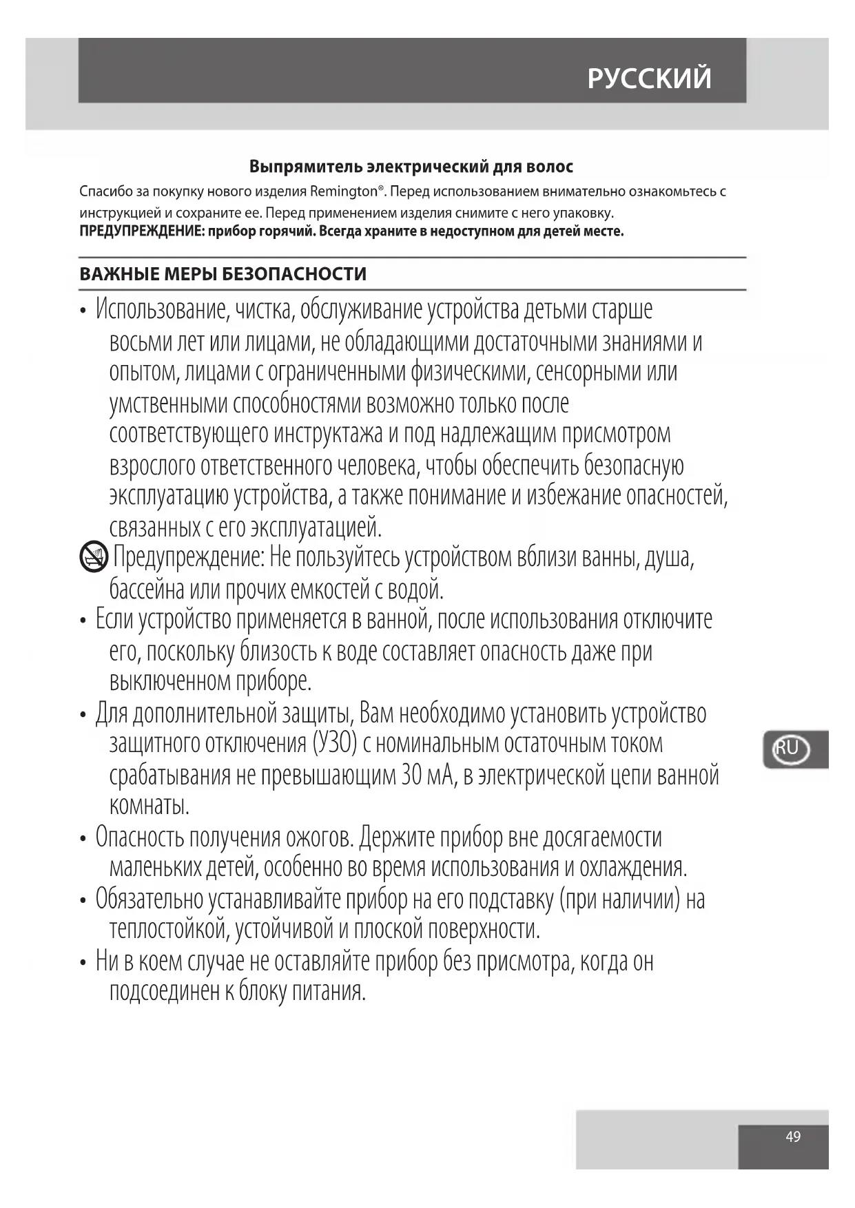 - При повреждении шнура следует немедленно прекратить использование устройства и вернуть устройство в ближайший авторизованный сервисный центр Remington® для ремонта или замены, чтобы избежать опасности.