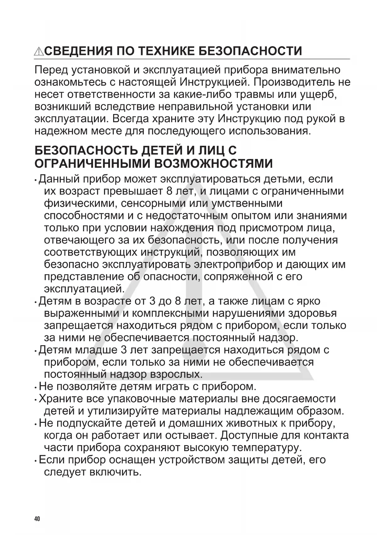 - Если прибор оснащен устройством защиты детей, его следует включить. 40• Очистка и доступное пользователю техническое обслуживание прибора не должно производиться детьми без присмотра. ОБЩИЕ ПРАВИЛА ТЕХНИКИ БЕЗОПАСНОСТИ