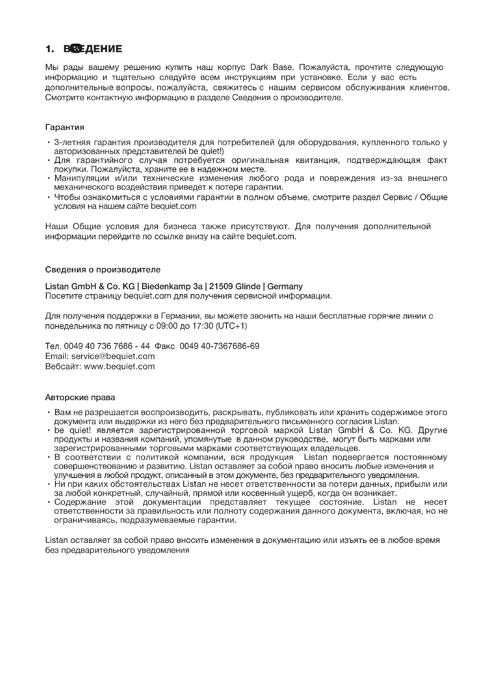∙ 3-летняя гарантия производителя для потребителей (для оборудования, купленного только у авторизованных представителей be quiet!) ∙ Для гарантийного случая потребуется оригинальная квитанция, подтверждающая факт покупки. Пожалуйста, храните ее в надежном месте. ∙ Манипуляции и/или технические изменения любого рода и повреждения из-за внешнего механического воздействия приведет к потере гарантии. ∙ Чтобы ознакомиться с условиями гарантии в полном объеме, смотрите раздел Сервис / Общие условия на нашем сайте bequiet.com Наши Общие условия для бизнеса также присутствуют. Для получения дополнительной информации перейдите по ссылке внизу на сайте bequiet.com. Сведения о производителе Listan GmbH & Co. KG | Biedenkamp 3a | 21509 Glinde | Germany Посетите страницу bequiet.com для получения сервисной информации. Для получения поддержки в Германии, вы можете звонить на наши бесплатные горячие линии с понедельника по пятницу с 09:00 до 17:30 (UTC+1) Teл. 0049 40 736 7686 - 44 Факс 0049 40-7367686-69 Email: service@bequiet.com Вебсайт: www.bequiet.com Авторские права ∙ Вам не разрешается воспроизводить, раскрывать, публиковать или хранить содержимое этого документа или выдержки из него без предварительного письменного согласия Listan. ∙ be quiet! является зарегистрированной торговой маркой Listan GmbH & Co. KG. Другие продукты и названия компаний, упомянутые в данном руководстве, могут быть марками или зарегистрированными торговыми марками соответствующих владельцев. ∙ В соответствии с политикой компании, вся продукция Listan подвергается постоянному совершенствованию и развитию. Listan оставляет за собой право вносить любые изменения и улучшения в любой продукт, описанный в этом документе, без предварительного уведомления. ∙ Ни при каких обстоятельствах Listan не несет ответственности за потери данных, прибыли или за любой конкретный, случайный, прямой или косвенный ущерб, когда он возникает. ∙ Содержание этой документации представляет текущее состояние. Listan не несет ответственности за правильность или полноту содержания данного документа, включая, но не ограничиваясь, подразумеваемые гарантии. Listan оставляет за собой право вносить изменения в документацию или изъять ее в любое время без предварительного уведомления40 41