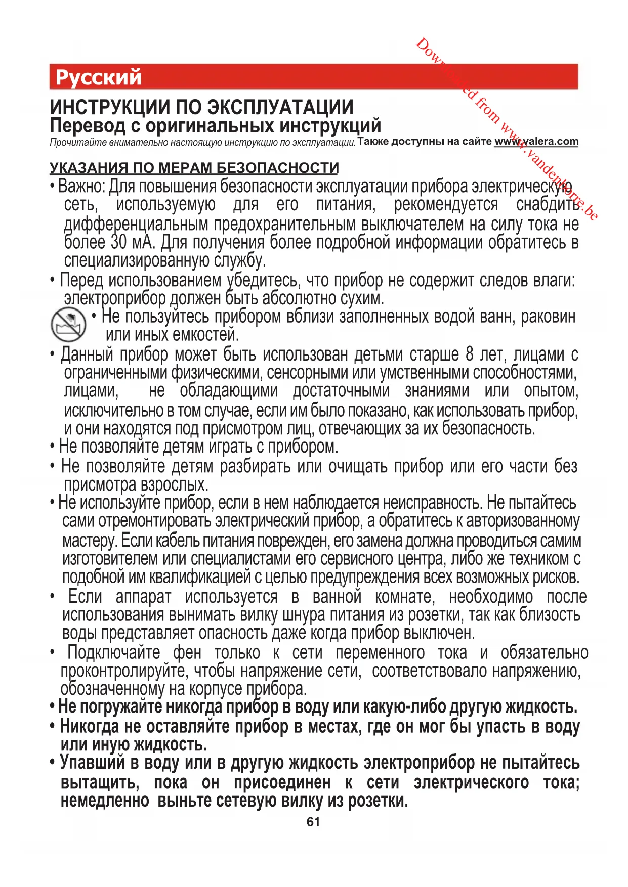 - Упавший в воду или в другую жидкость электроприбор не пытайтесь вытащить, пока он присоединен к сети электрического тока; немедленно выньте сетевую вилку из розетки. Downloaded from www.vandenborre.be62