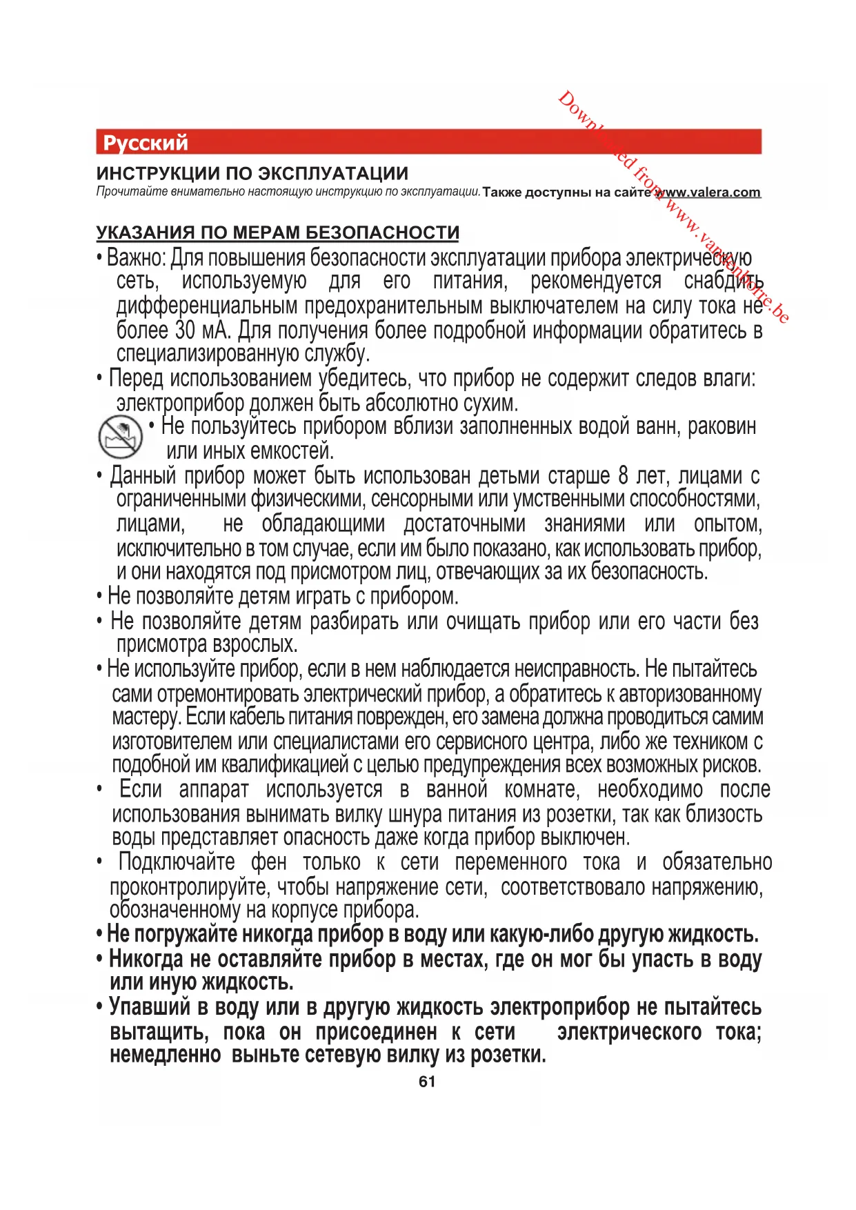 ИНСТРУКЦИИ ПО ЭКСПЛУАТАЦИИ Прочитайте внимательно настоящую инструкцию по эксплуатации. Также доступны на сайте www.valera.com УКАЗАНИЯ ПО МЕРАМ БЕЗОПАСНОСТИ