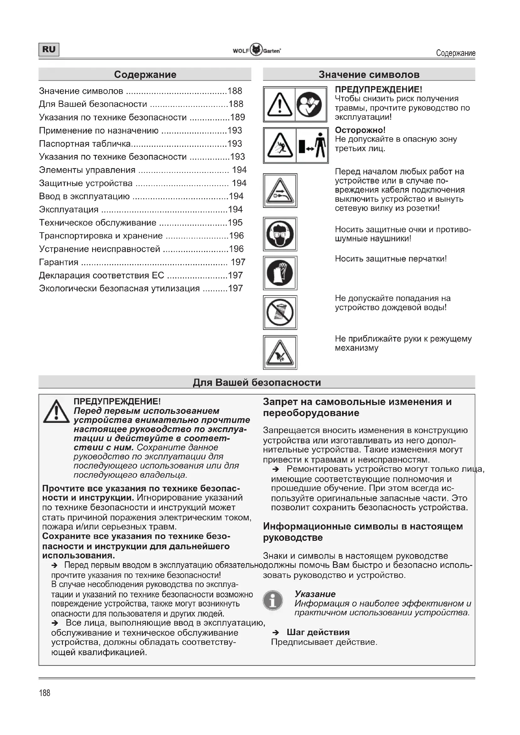 - Экологически безопасная утилизация Значение символов ПРЕДУПРЕЖДЕНИЕ! Чтобы снизить риск получения травмы, прочтите руководство по эксплуатации! p. 197
