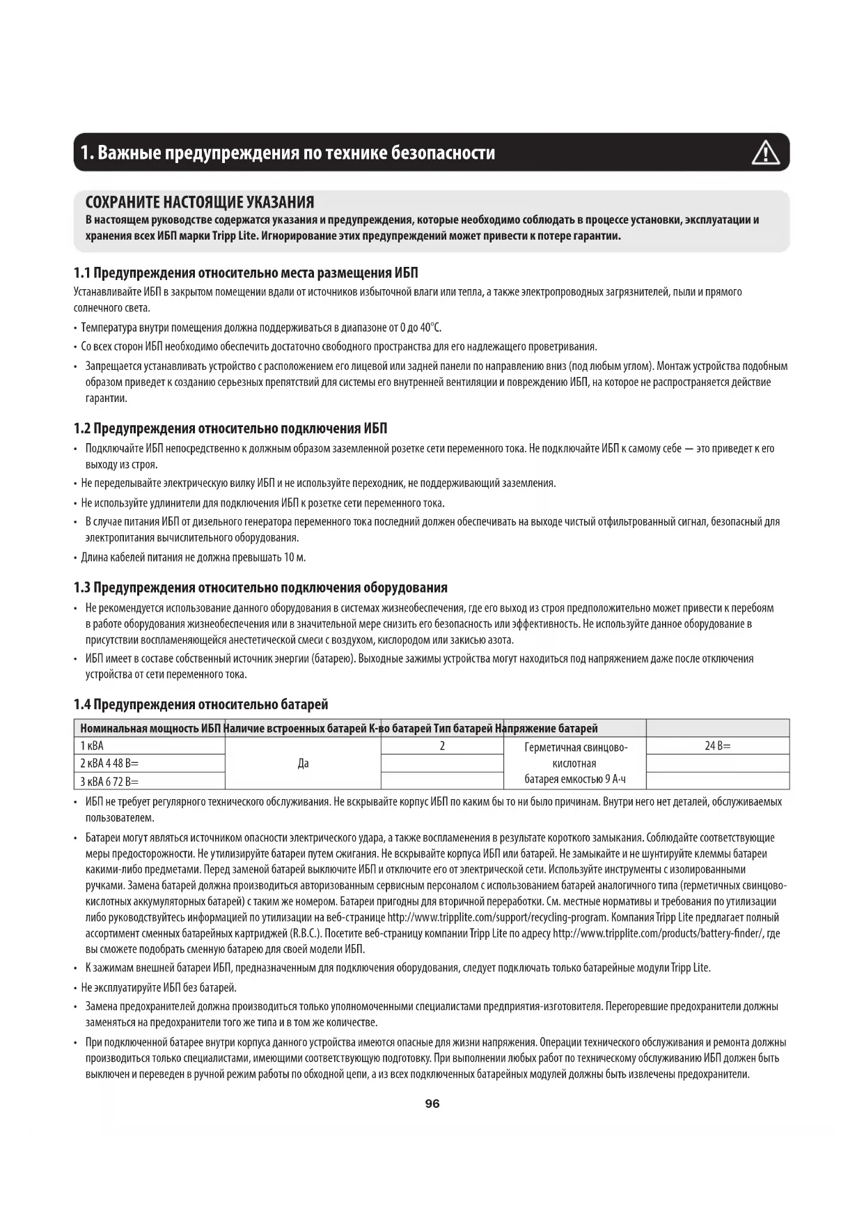СОХРАНИТЕ НАСТОЯЩИЕ УКАЗАНИЯ В настоящем руководстве содержатся указания и предупреждения, которые необходимо соблюдать в процессе установки, эксплуатации и хранения всех ИБП марки Tripp Lite. Игнорирование этих предупреждений может привести к потере гарантии.