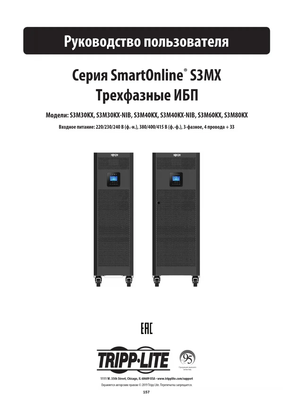 S3MX Трехфазные ИБП Модели: S3M30KX, S3M30KX-NIB, S3M40KX, S3M40KX-NIB, S3M60KX, S3M80KX Входное питание: 220/230/240 В (ф.-н.), 380/400/415 В (ф.-ф.), 3-фазное, 4 провода + ЗЗ 1111 W. 35th Street, Chicago, IL 60609 USA • www.tripplite.com/support Охраняется авторским правом © 2019 Tripp Lite. Перепечатка запрещается.158