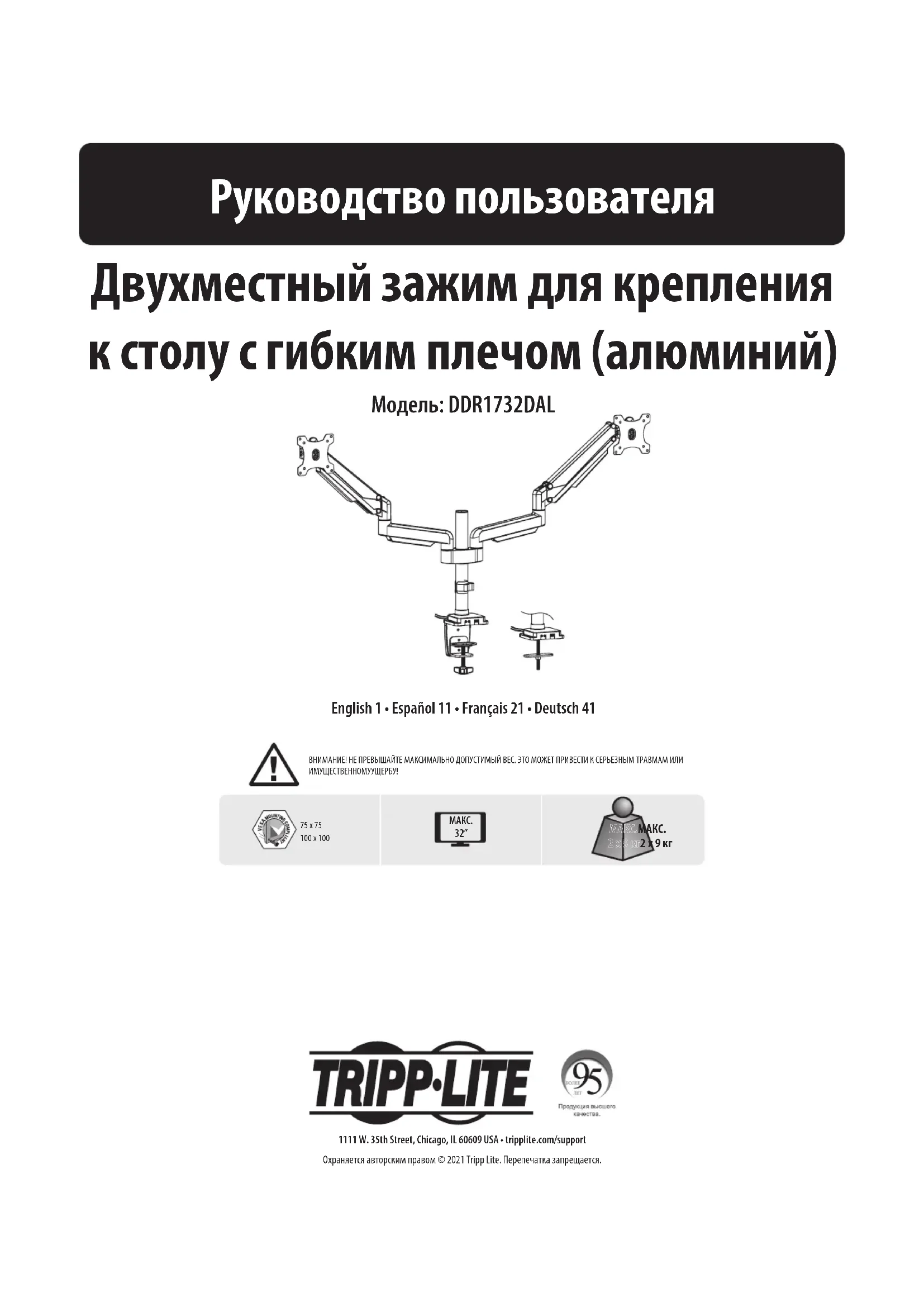 - Pour toute question, visiter www.tripplite.com/support. 1111 W. 35th Street, Chicago, IL 60609 USA • tripplite.com/support20-10-211 • 93-3D49_RevA31 Руководcтво пользoвателя Двухместный зажим для крепления к столу с гибким плечом (алюминий) Модель: DDR1732DAL 1111 W. 35th Street, Chicago, IL 60609 USA • tripplite.com/supportОхраняется авторским правом © 2021 Tripp Lite. Перепечатка запрещается.ВНИМАНИЕ! НЕ ПРЕВЫШАЙТЕ МАКСИМАЛЬНО ДОПУСТИМЫЙ ВЕС. ЭТО МОЖЕТ ПРИВЕСТИ К СЕРЬЕЗНЫМ ТРАВМАМ ИЛИ ИМУЩЕСТВЕННОМУ УЩЕРБУ!75 x 75100 x 100МАКС. 32”