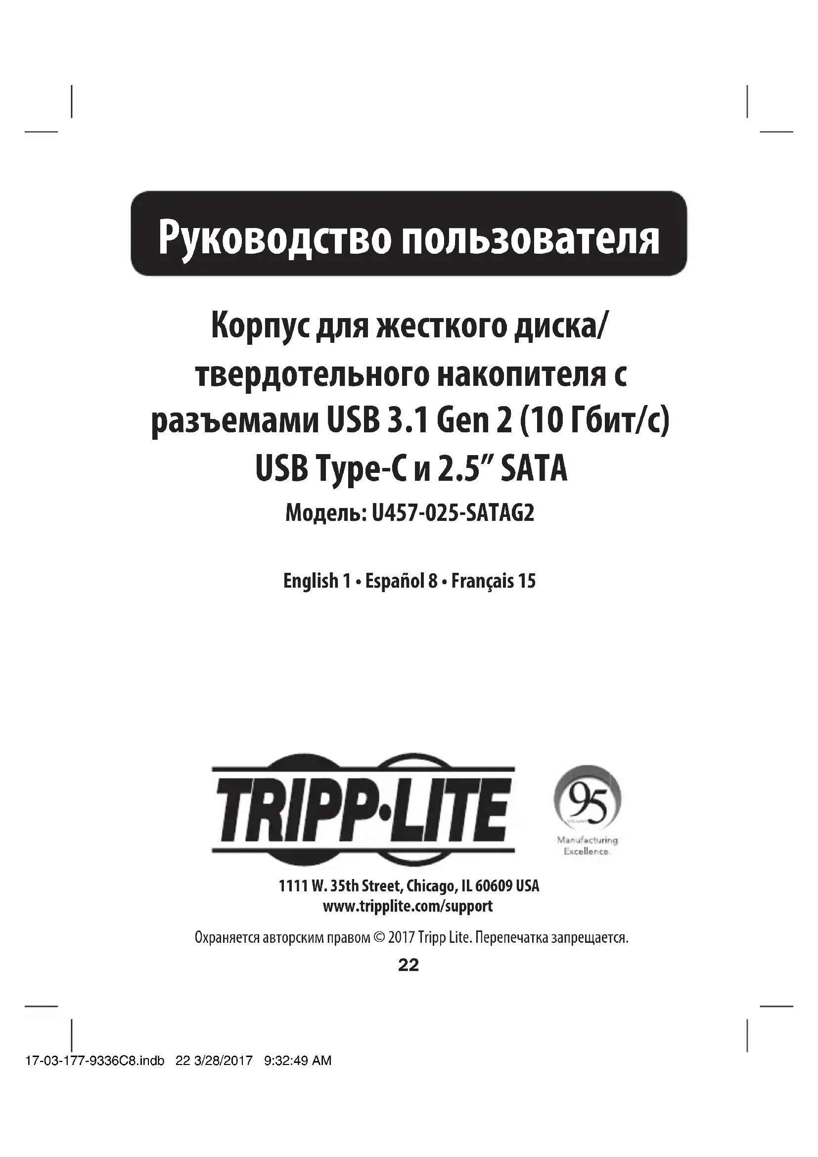 цвета указывает на наличие питания; во время считывания/записи данных этот индикатор работает в мигающем режиме. Технические характеристики: Разъем накопителя 22-контактный интерфейсно-силовой разъем SATA Разъем USB USB Type-C СИД Белый: питание и доступ к данным Максимальная скорость передачи данных 10 Гбит/с Максимальная емкость накопителя Подтвержденная: до 2 ТБ Диапазон рабочих температур От 10 до 50°C Рабочий диапазон влажности Относительная влажность от 10 до 80% USB Type-C и USB-C являются товарными знаками компании USB Implementers Forum 17-03-177-9336C8.indb 26 3/28/2017 9:32:49 AM27 Гарантийные обязательства Ограниченная гарантия сроком на 1 год Компания TRIPP LITE гарантирует отсутствие дефектов материалов и изготовления в течение одного (1) года с момента первоначальной покупки. Обязательства компании TRIPP LITE по настоящей гарантии ограничиваются ремонтом или заменой (по ее единоличному усмотрению) любых таких дефектных изделий. Для получения услуг по данной гарантии необходимо получить номер Returned Material Authorization (RMA - разрешение на возврат материалов) от компании TRIPP LITE или ее авторизованного сервисного центра. Изделия должны быть возвращены в компанию TRIPP LITE или авторизованный сервисный центр TRIPP LITE с предоплатой транспортных расходов и сопровождаться кратким описанием возникшей проблемы и документом, подтверждающим дату и место его приобретения. Действие настоящей гарантии не распространяется на оборудование, поврежденное в результате аварии, небрежного обращения или неправильного использования, а также видоизмененное каким бы то ни было образом.