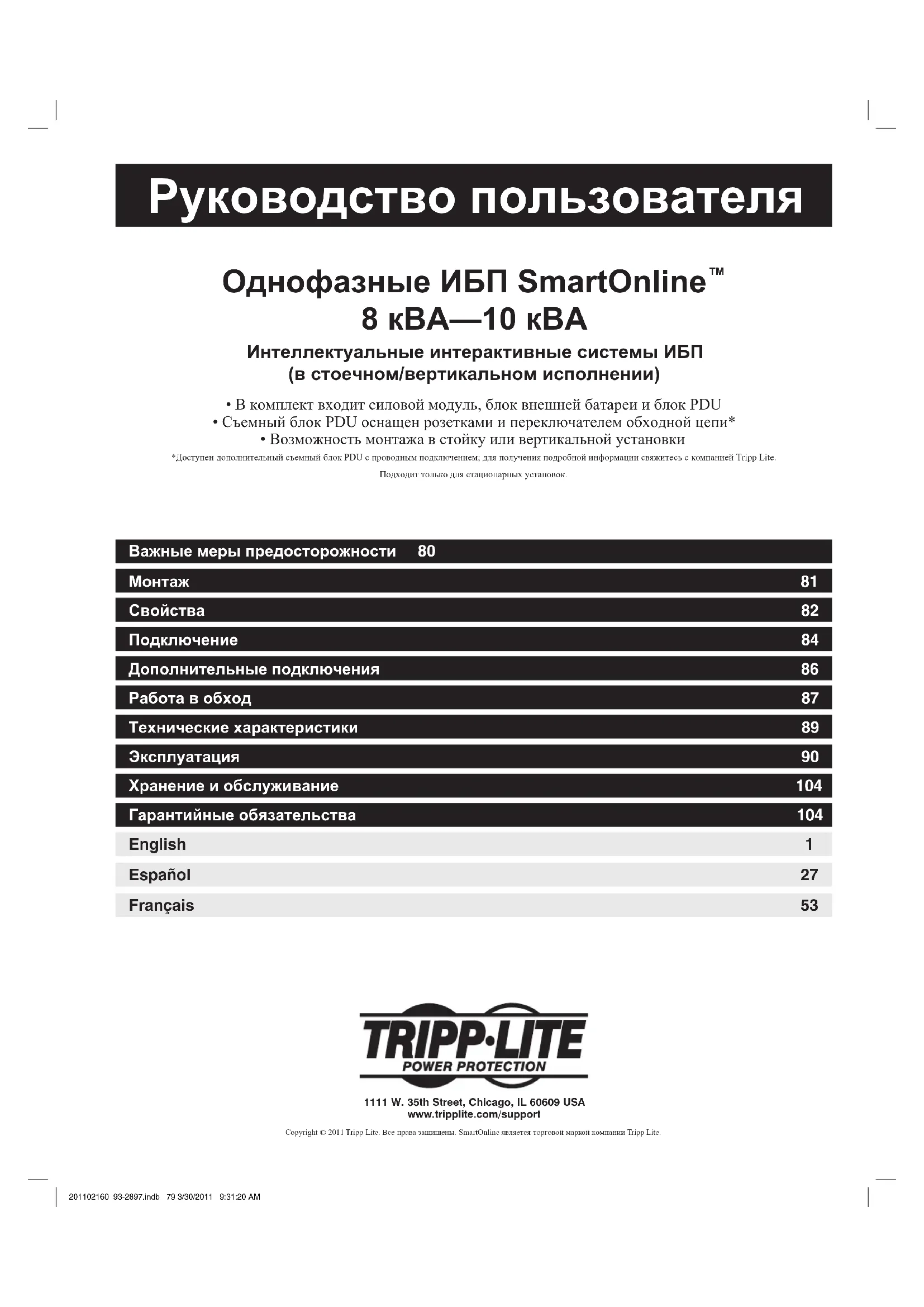 - Возможность монтажа в стойку или вертикальной установки *Доступен дополнительный съемный блок PDU с проводным подключением; для получения подробной информации свяжитесь с компанией Tripp Lite. Подходит только для стационарных установок. Важные меры предосторожности 80 Монтаж 81 Подключение 84 Свойства 82 Эксплуатация 90 Хранение и обслуживание 104 Гарантийные обязательства 104 English 1 Дополнительные подключения 86 Работа в обход 87 Технические характеристики 89 Español 27 Français 53 201102160 93-2897.indb 79 3/30/2011 9:31:20 AM80 Важные меры предосторожности СОХРАНИТЕ ЭТИ ПРАВИЛА. В данном руководстве содержатся важные инструкции и меры предосторожности, которые следует соблюдать во время установки и обслуживания всех систем ИБП Tripp Lite серии SmartOnline в стоечном/вертикальном исполнении и их батарей. Несоблюдение этих правил может повлиять на гарантию. Правила безопасности при выборе места установки ИБП
