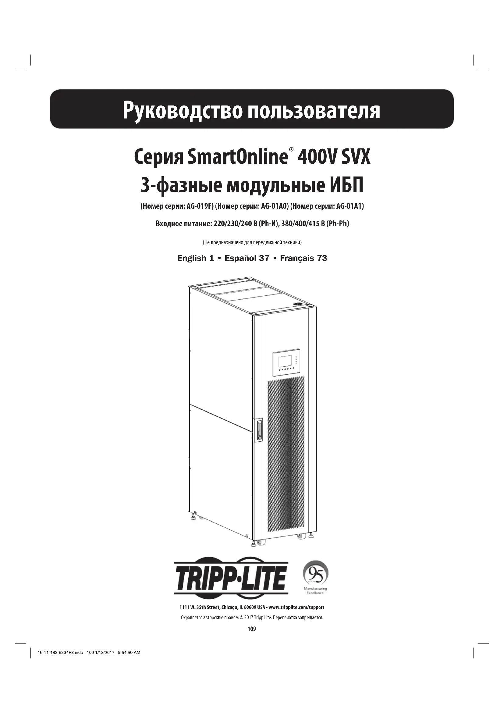 400V SVX 3-фазные модульные ИБП (Номер серии: AG-019F) (Номер серии: AG-01A0) (Номер серии: AG-01A1) Входное питание: 220/230/240 В (Ph-N), 380/400/415 В (Ph-Ph) (Не предназначено для передвижной техники) English 1 • Español 37 • Français 73 1111 W. 35th Street, Chicago, IL 60609 USA • www.tripplite.com/supportОхраняется авторским правом © 2017 Tripp Lite. Перепечатка запрещается.16-11-183-9334F8.indb 109 1/18/2017 9:54:50 AM110