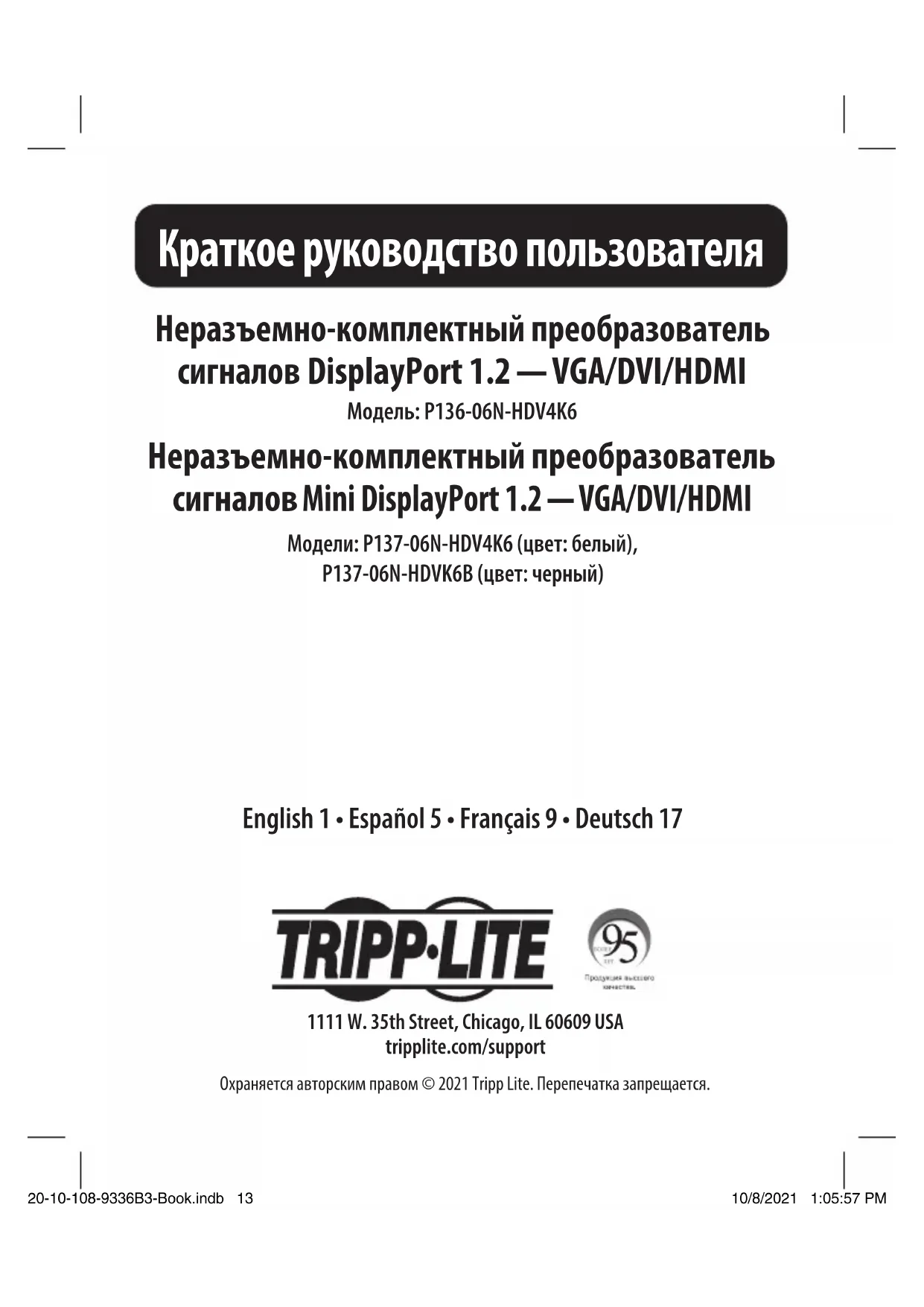 - Отправку нового оборудования на переработку после окончательной выработки его ресурсаВНИМАНИЕ! Не рекомендуется использование данного оборудования в системах жизнеобеспечения, где его выход из строя предположительно может привести к перебоям в работе оборудования жизнеобеспечения или в значительной мере снизить его безопасность или эффективность. Компания Tripp Lite постоянно совершенствует свою продукцию. B связи с этим возможно изменение технических характеристик без предварительного уведомления. Внешний вид реальных изделий может несколько отличаться от представленного на фотографиях и иллюстрациях.20-10-108 93-36B3_RevC 1111 W. 35th Street, Chicago, IL 60609 USA tripplite.com/support 20-10-108-9336B3-Book.indb 1620-10-108-9336B3-Book.indb 16 10/8/2021 1:05:57 PM10/8/2021 1:05:57 PM17 Kurzanleitung DisplayPort 1.2-zu-VGA/DVI/ HDMI All-in-One-Konverter Modell: P136-06N-HDV4K6 Mini DisplayPort 1.2-zu-VGA/ DVI/HDMI All-in-One-Konverter Modelle: P137-06N-HDV4K6 (Weiß), P137-06N-HDVK6B (Schwarz) 1111 W. 35th Street, Chicago, IL 60609 USA tripplite.com/support Copyright © 2021 Tripp Lite. Alle Rechte vorbehalten. English 1 • Español 5 • Français 9 • Русский 13 20-10-108-9336B3-Book.indb 1720-10-108-9336B3-Book.indb 17 10/8/2021 1:05:57 PM10/8/2021 1:05:57 PM18 Produktmerkmale Systemanforderungen