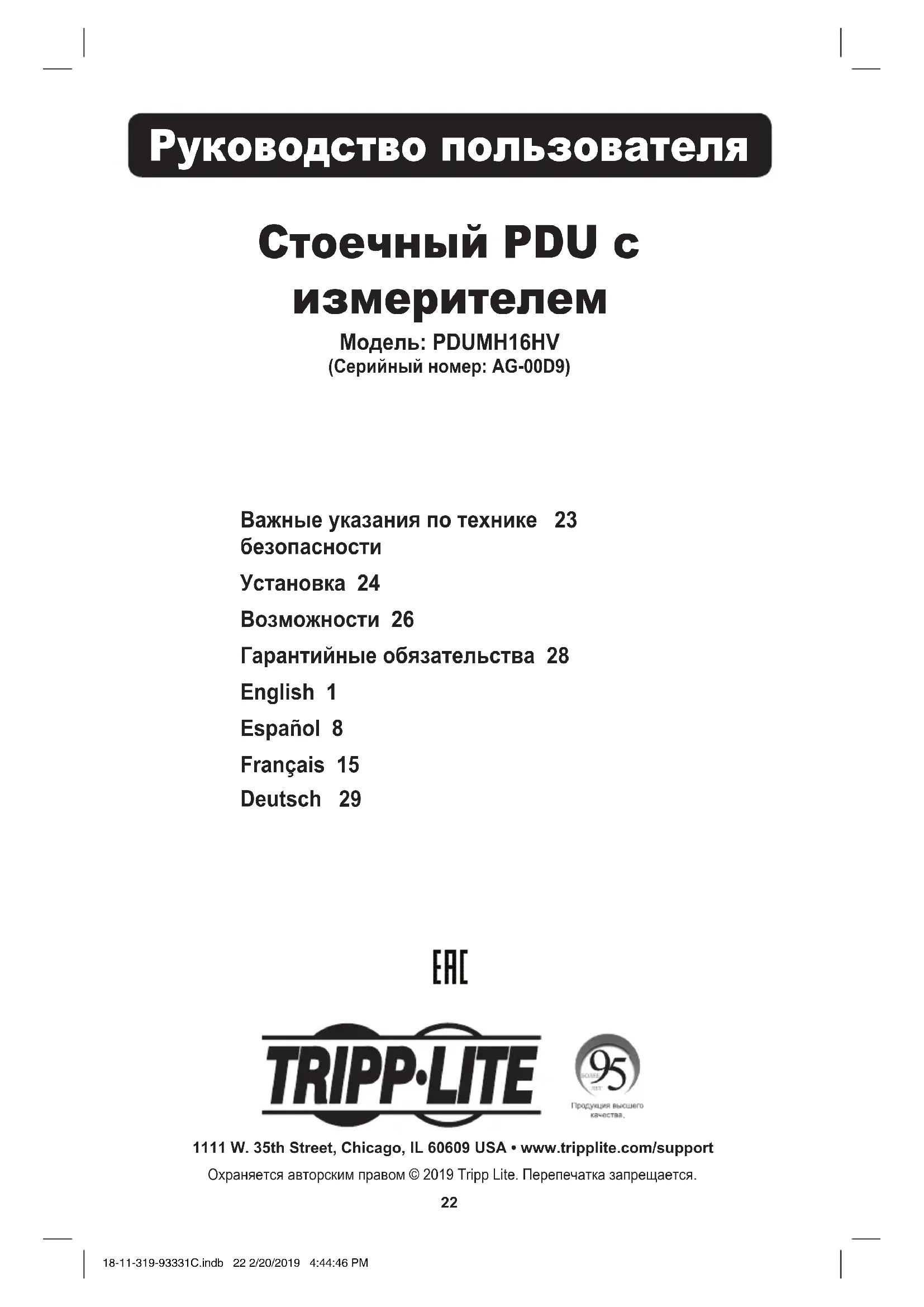 - Renvoyer le matériel neuf pour recyclage quand ceci devient éventuellement un rebut La politique de Tripp Lite est celle d’une amélioration continuelle. Les spécifications peuvent être modifiées sans préavis. 1111 W. 35th Street, Chicago, IL 60609 USA • www.tripplite.com/support 18-11-319 93-331C_revB 18-11-319-93331C.indb 21 2/20/2019 4:44:46 PM22 Руководство пользователя Стоечный PDU с измерителем Модель: PDUMH16HV (Серийный номер: AG-00D9) Важные указания по технике 23 безопасности Установка 24 Возможности 26 Гарантийные обязательства 28 English 1 Español 8 Français 15 Deutsch 29 1111 W. 35th Street, Chicago, IL 60609 USA • www.tripplite.com/support Охраняется авторским правом © 2019 Tripp Lite. Перепечатка запрещается. 18-11-319-93331C.indb 22 2/20/2019 4:44:46 PM23 Важные указания по технике безопасности СОХРАНИТЕ НАСТОЯЩИЕ УКАЗАНИЯ В настоящем руководстве содержатся указания и предупреждения, которые необходимо соблюдать в процессе установки, эксплуатации и хранения данного изделия. Игнорирование этих указаний и предупреждений может привести к потере гарантии на изделие. Важные предупреждения