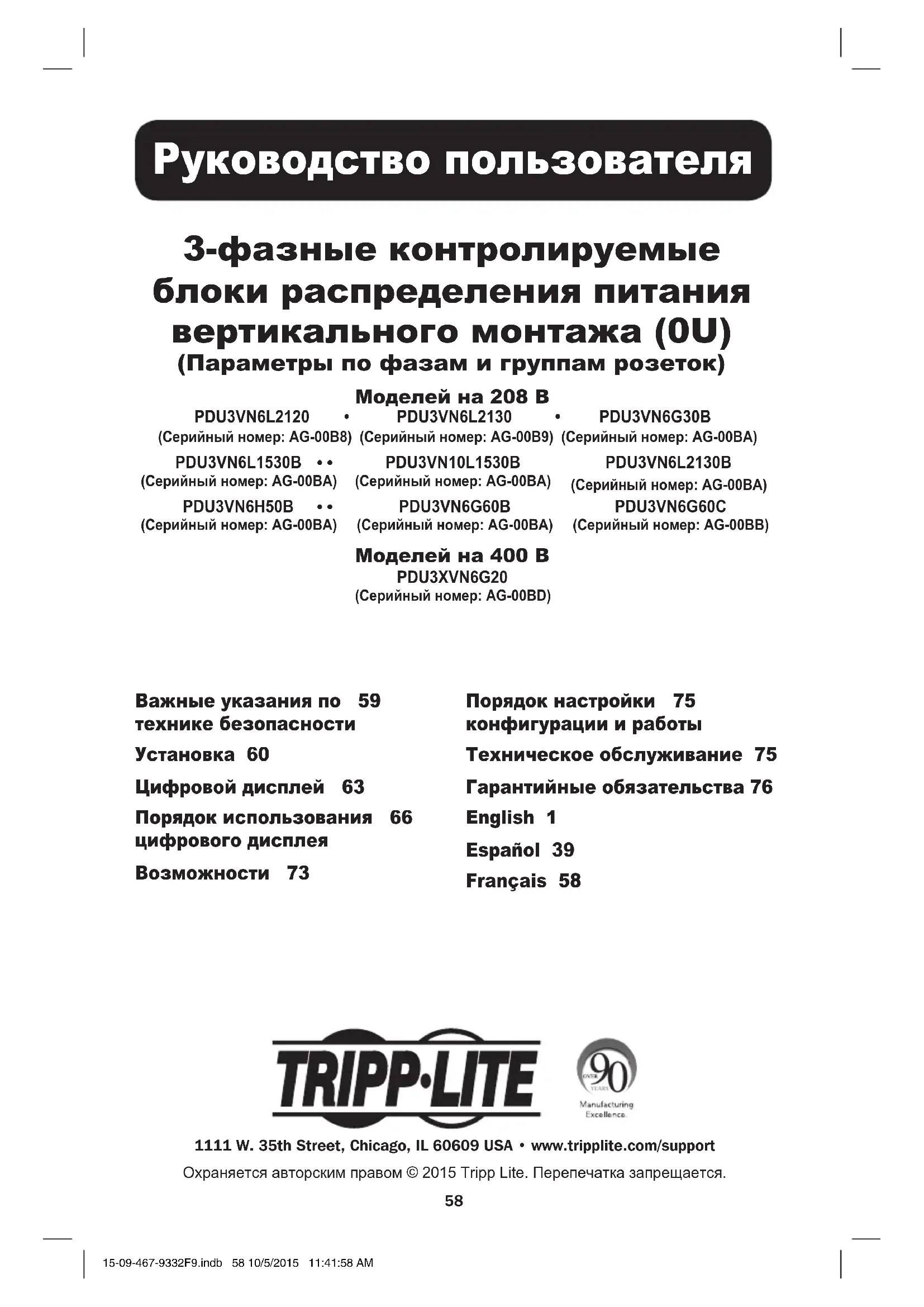 (Серийный номер: AG-00BD) Важные указания по 59 технике безопасности Установка 60 Цифровой дисплей 63 Порядок использования 66 цифрового дисплея Возможности 73 Порядок настройки 75 конфигурации и работы Техническое обслуживание 75 Гарантийные обязательства 76 English 1 Español 39 Français 58 1111 W. 35th Street, Chicago, IL 60609 USA • www.tripplite.com/supportОхраняется авторским правом © 2015 Tripp Lite. Перепечатка запрещается.