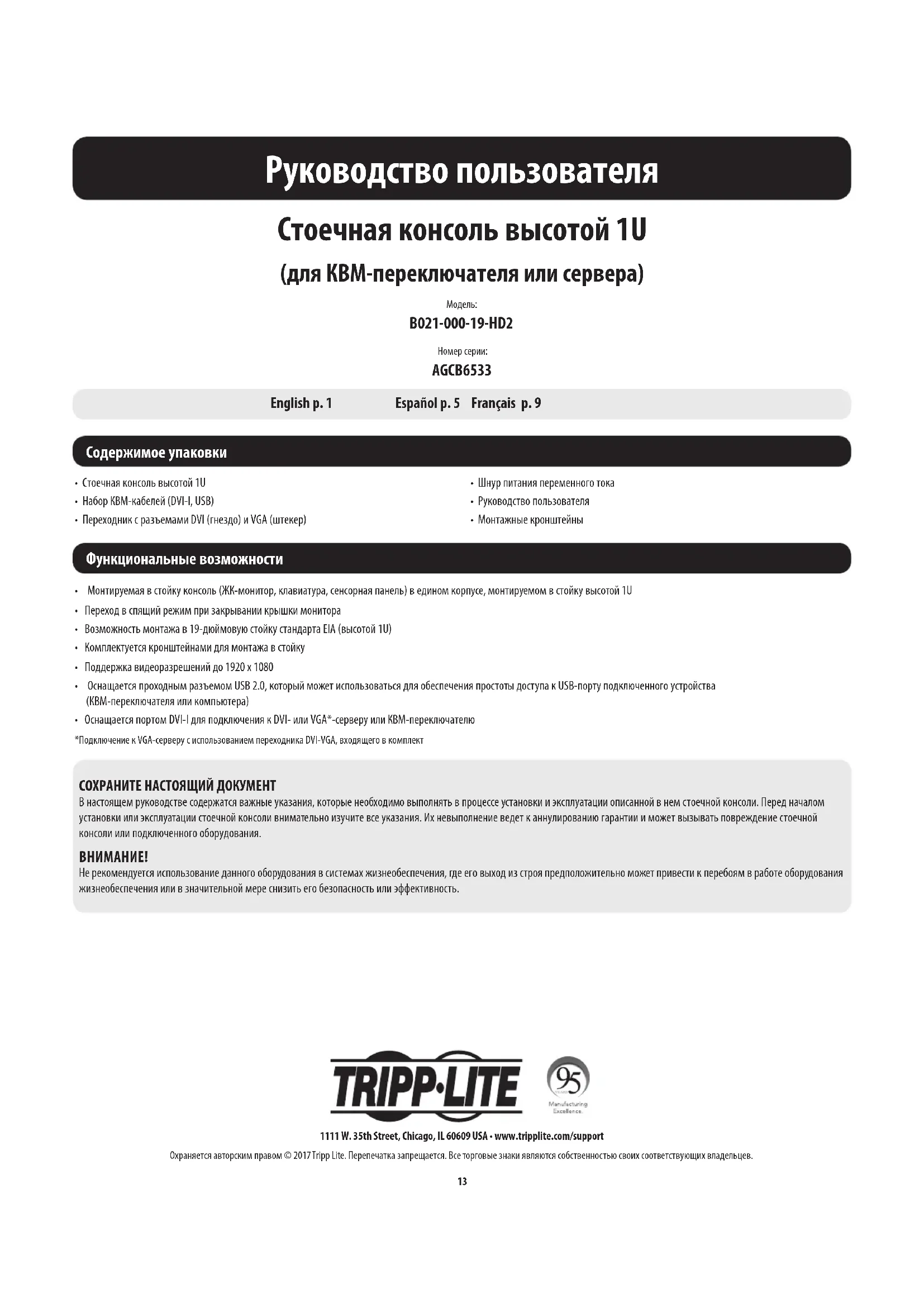 Найдите руководство к устройству бесплатно B02100019HD2 Tripp Lite в формате PDF.