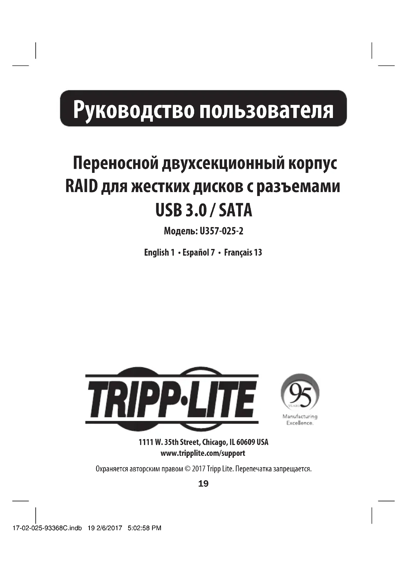 Внизу Вверху RAID0 Объединяет два диска в один большой диск для повышения производительности системы Вверху Вверху 17-02-025-93368C.indb 22 2/6/2017 5:02:58 PM23 Технические характеристики Гарантийные обязательства Разъемы SATA 22-контактный интерфейсно-силовой разъем SATA (2 шт.) Разъемы USB Интерфейсный: USB 3.0 Micro-B Data (гнездовой) Силовой: USB 2.0 Micro-B Power (гнездовой) Максимальная емкость диска Подтвержденная: до 2 ТБ Диапазон рабочих температур От 10 до 50°C Рабочий диапазон влажности Относительная влажность: от 10% до 80% Ограниченная гарантия 1 год. Компания TRIPP LITE гарантирует отсутствие дефектов материалов и изготовления в течение одного (1) года с момента первоначальной покупки. Обязательства компании TRIPP LITE по настоящей гарантии ограничиваются ремонтом или заменой (по ее единоличному усмотрению) любых таких дефектных изделий. Для получения услуг по данной гарантии необходимо получить номер Returned Material Authorization (RMA - разрешение на возврат материалов) от компании TRIPP LITE или ее авторизованного сервисного центра. Изделия должны быть возвращены в компанию TRIPP LITE или авторизованный сервисный центр TRIPP LITE с предоплатой транспортных расходов и сопровождаться кратким описанием возникшей проблемы и документом, подтверждающим дату и место его приобретения. Действие настоящей гарантии не распространяется на оборудование, поврежденное в результате аварии, небрежного обращения или неправильного использования, а также видоизмененное каким бы то ни было образом.