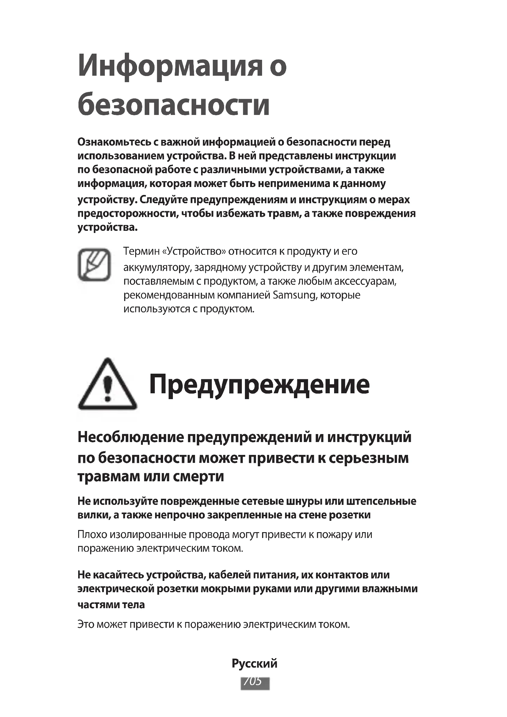 Информация о безопасности Ознакомьтесь с важной информацией о безопасности перед использованием устройства. В ней представлены инструкции по безопасной работе с различными устройствами, а также информация, которая может быть неприменима к данному устройству. Следуйте предупреждениям и инструкциям о мерах предосторожности, чтобы избежать травм, а также повреждения устройства.Термин «Устройство» относится к продукту и его аккумулятору, зарядному устройству и другим элементам, поставляемым с продуктом, а также любым аксессуарам, рекомендованным компанией Samsung, которые используются с продуктом. Предупреждение Несоблюдение предупреждений и инструкций по безопасности может привести к серьезным травмам или смерти Не используйте поврежденные сетевые шнуры или штепсельные вилки, а также непрочно закрепленные на стене розеткиПлохо изолированные провода могут привести к пожару или поражению электрическим током.Не касайтесь устройства, кабелей питания, их контактов или электрической розетки мокрыми руками или другими влажными частями телаЭто может привести к поражению электрическим током.Русский