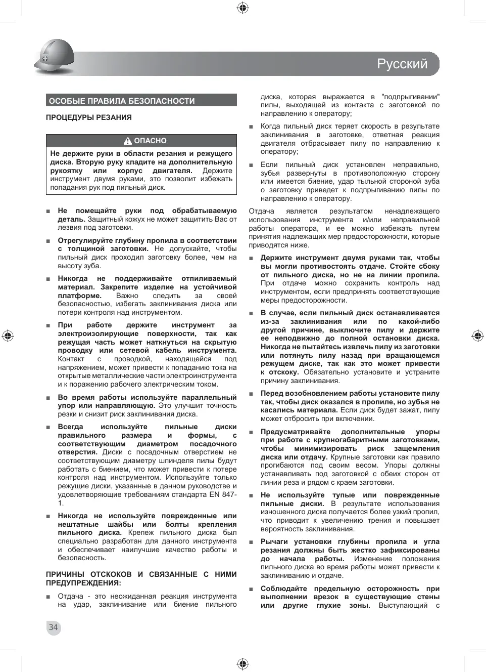 Русский диска, которая выражается в "подпрыгивании" пилы, выходящей из контакта с заготовкой по направлению к оператору;