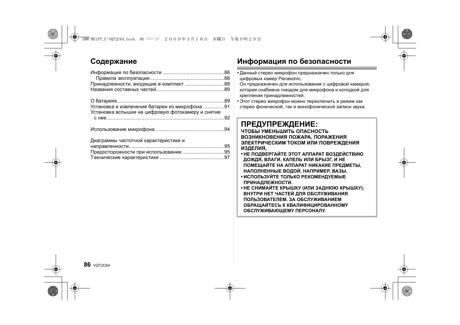 - Это может привести к короткому замыканию или нагреву батареек, так что вы можете получить сильный ожог, если прикоснетесь к ним. Не пытайтесь перезаряжать сухие батарейки. Не бросайте батарейки в огонь и не подвергайте сильному нагреванию, например от солнечных лучей. DMW-MS1PP_E-VQT2C64.book 97 ページ