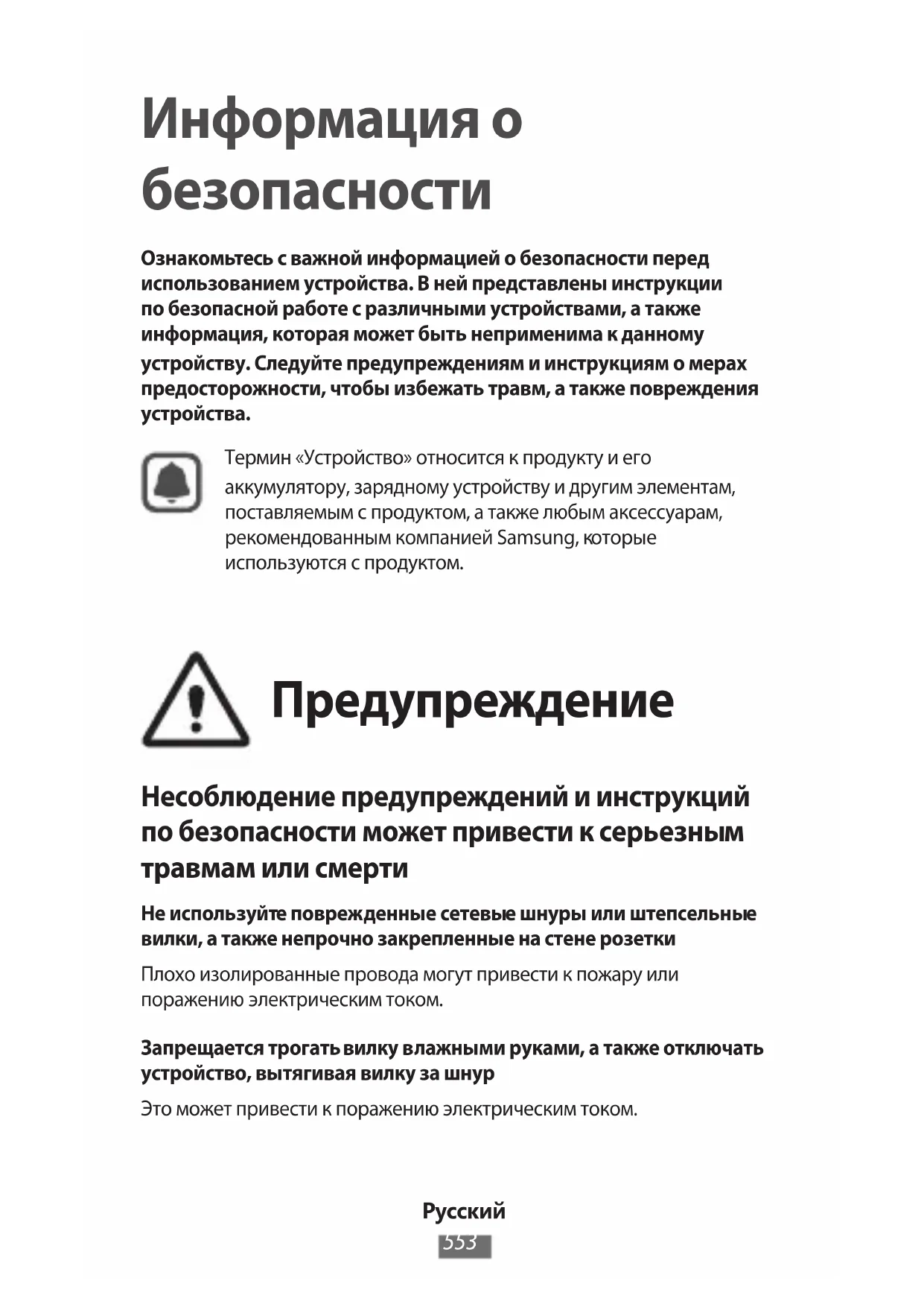 Информация о безопасности Ознакомьтесь с важной информацией о безопасности перед использованием устройства. В ней представлены инструкции по безопасной работе с различными устройствами, а также информация, которая может быть неприменима к данному устройству. Следуйте предупреждениям и инструкциям о мерах предосторожности, чтобы избежать травм, а также повреждения устройства.Термин «Устройство» относится к продукту и его аккумулятору, зарядному устройству и другим элементам, поставляемым с продуктом, а также любым аксессуарам, рекомендованным компанией Samsung, которые используются с продуктом. Предупреждение Несоблюдение предупреждений и инструкций по безопасности может привести к серьезным травмам или смерти Не используйте поврежденные сетевые шнуры или штепсельные вилки, а также непрочно закрепленные на стене розеткиПлохо изолированные провода могут привести к пожару или поражению электрическим током. Запрещается трогать вилку влажными руками, а также отключать устройство, вытягивая вилку за шнурЭто может привести к поражению электрическим током.Русский