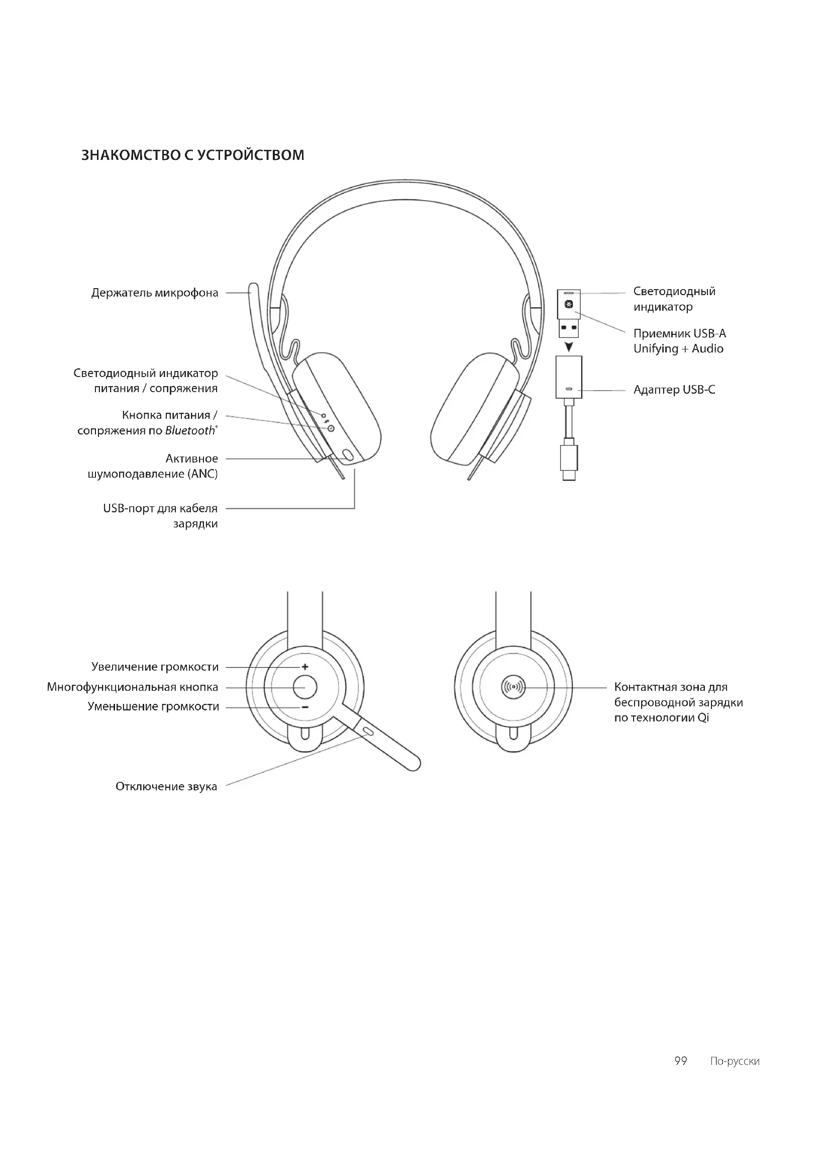ПриемникUSB-A Unifying+Audio Увеличение громкости Уменьшение громкости Отключение звука Многофункциональная кнопка Контактная зона для беспроводной зарядки по технологииQi 99 По-русскиUSB-A USB-C ADAPTER USB-A | USB-C Logi Zone900