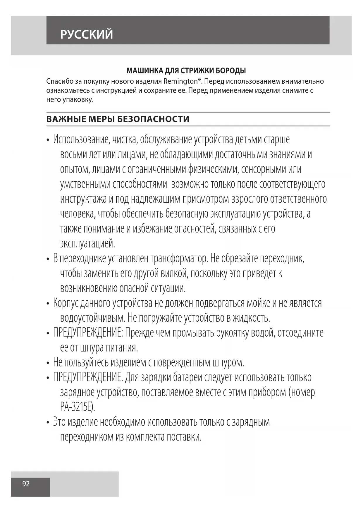 AE92 МАШИНКА ДЛЯ СТРИЖКИ БОРОДЫ Спасибо за покупку нового изделия Remington®. Перед использованием внимательно ознакомьтесь с инструкцией и сохраните ее. Перед применением изделия снимите с него упаковку. ВАЖНЫЕ МЕРЫ БЕЗОПАСНОСТИ