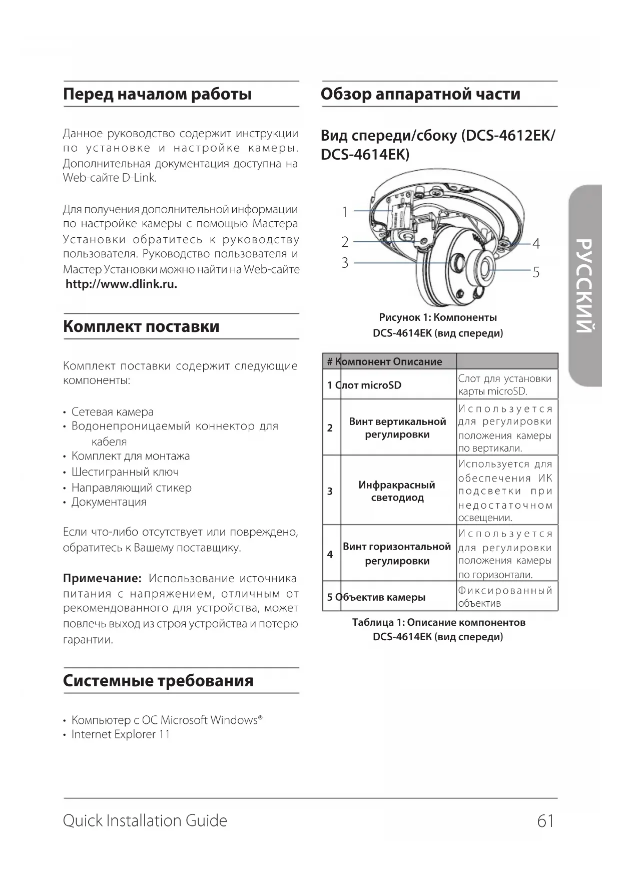 Обзор аппаратной части Вид спереди/сбоку (DCS-4612EK/ DCS-4614EK) Рисунок 1: Компоненты DCS-4614EK (вид спереди)# Компонент Описание1 Слот microSD Слот для установки карты microSD. Винт вертикальной регулировкиИспользуется для регулировки положения камеры по вертикали. Инфракрасный светодиодИспользуется для обеспечения ИК подсветки при недостаточном освещении. Винт горизонтальной регулировкиИспользуется для регулировки положения камеры по горизонтали.5 Объектив камерыФиксированный объективТаблица 1: Описание компонентов DCS-4614EК (вид спереди) Перед началом работы Данное руководство содержит инструкции по установке и настройке камеры. Дополнительная документация доступна на Web-сайте D-Link. Для получения дополнительной информации по настройке камеры с помощью Мастера Установки обратитесь к руководству пользователя. Руководство пользователя и Мастер Установки можно найти на Web-сайте http://www.dlink.ru. Комплект поставки Комплект поставки содержит следующие компоненты: