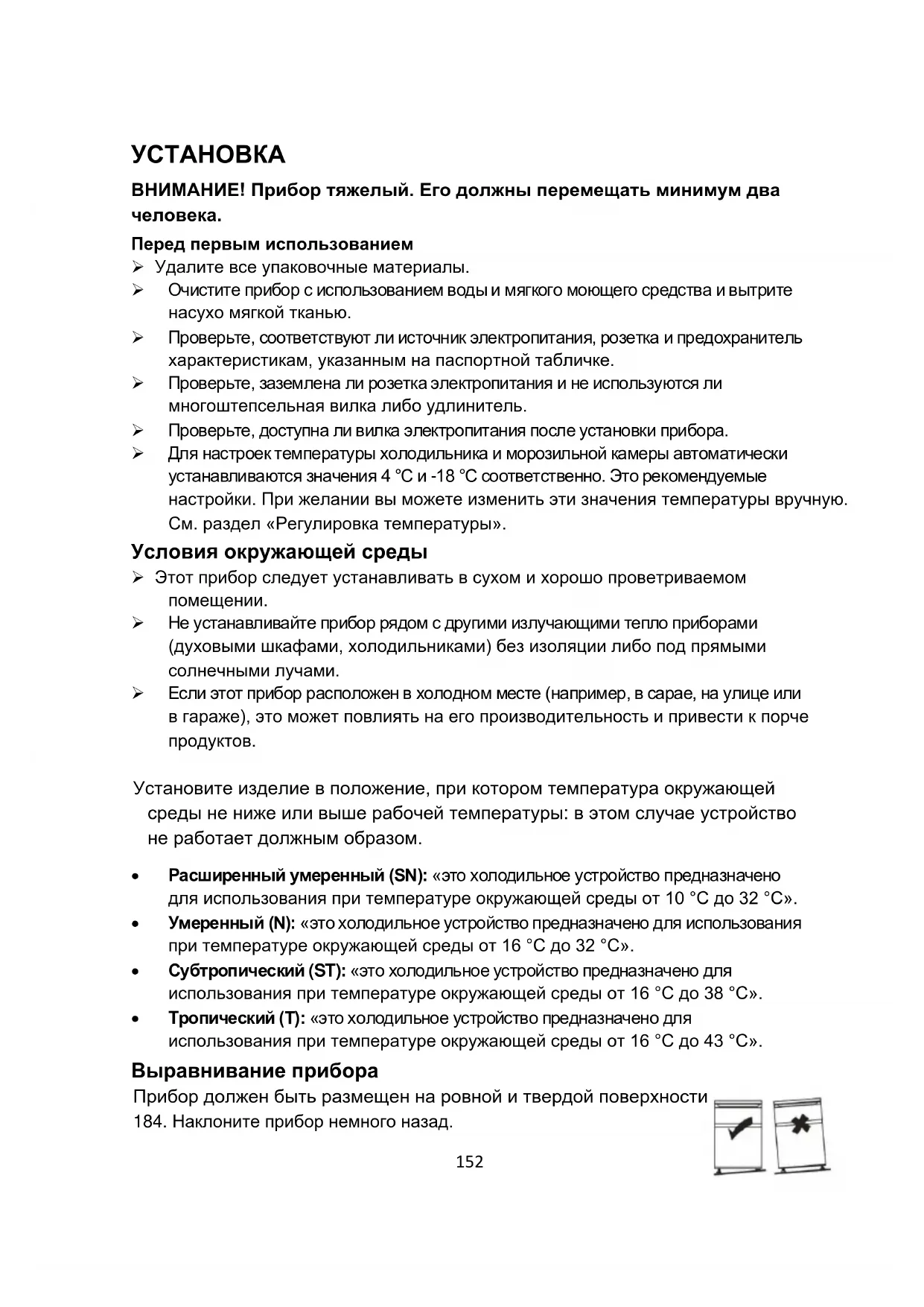 - Тропический (T): «это холодильное устройство предназначено для использования при температуре окружающей среды от 16 °С до 43 °С». Выравнивание прибора Прибор должен быть размещен на ровной и твердой поверхности