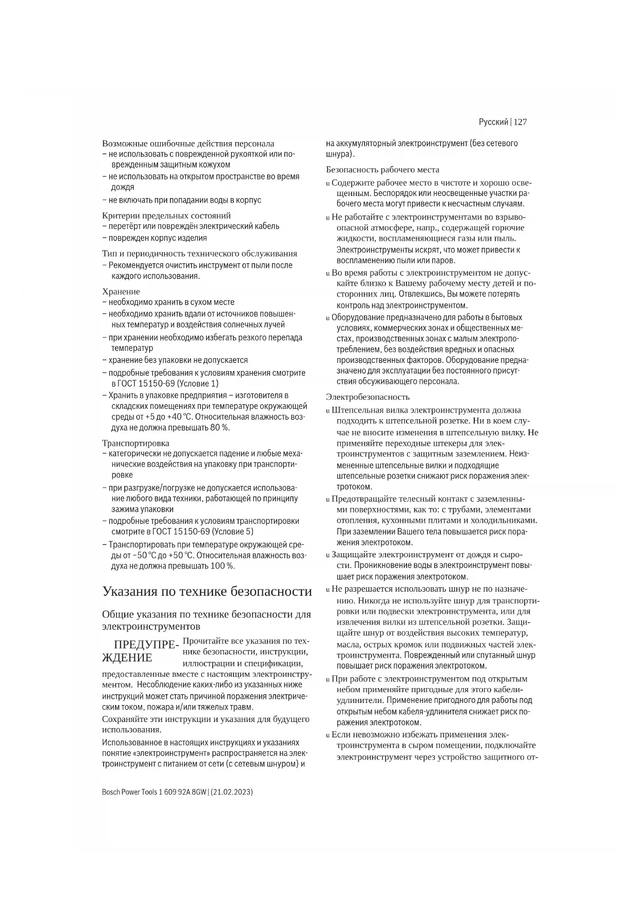 Toлько для стран Евразийского экономического союза (Таможенного союза) В состав эксплуатационных документов, предусмотрен- ных изготовителем для продукции, могут входить настоя- щее руководство по эксплуатации, а также приложения. Информация о подтверждении соответствия содержится в приложении. Информация о стране происхождения указана на корпу- се изделия и в приложении. Дата изготовления указана на последней странице об- ложки Руководства. Контактная информация относительно импортера содер- жится на упаковке. Срок службы изделия Срок службы изделия составляет 7 лет. Не рекомендует- ся к эксплуатации по истечении 5 лет хранения с даты изготовления без предварительной проверки (дату изго- товления см. на этикетке). Указанный срок службы действителен при соблюдении потребителем требований настоящего руководства. Перечень критических отказов – не использовать при сильном искрении – не использовать при появлении сильной вибрации – не использовать с перебитым или оголённым электри- ческим кабелем – не использовать при появлении дыма непосредствен- но из корпуса изделия 1 609 92A 8GW | (21.02.2023) Bosch Power ToolsРусский | 127 Возможные ошибочные действия персонала – не использовать с поврежденной рукояткой или по- врежденным защитным кожухом – не использовать на открытом пространстве во время