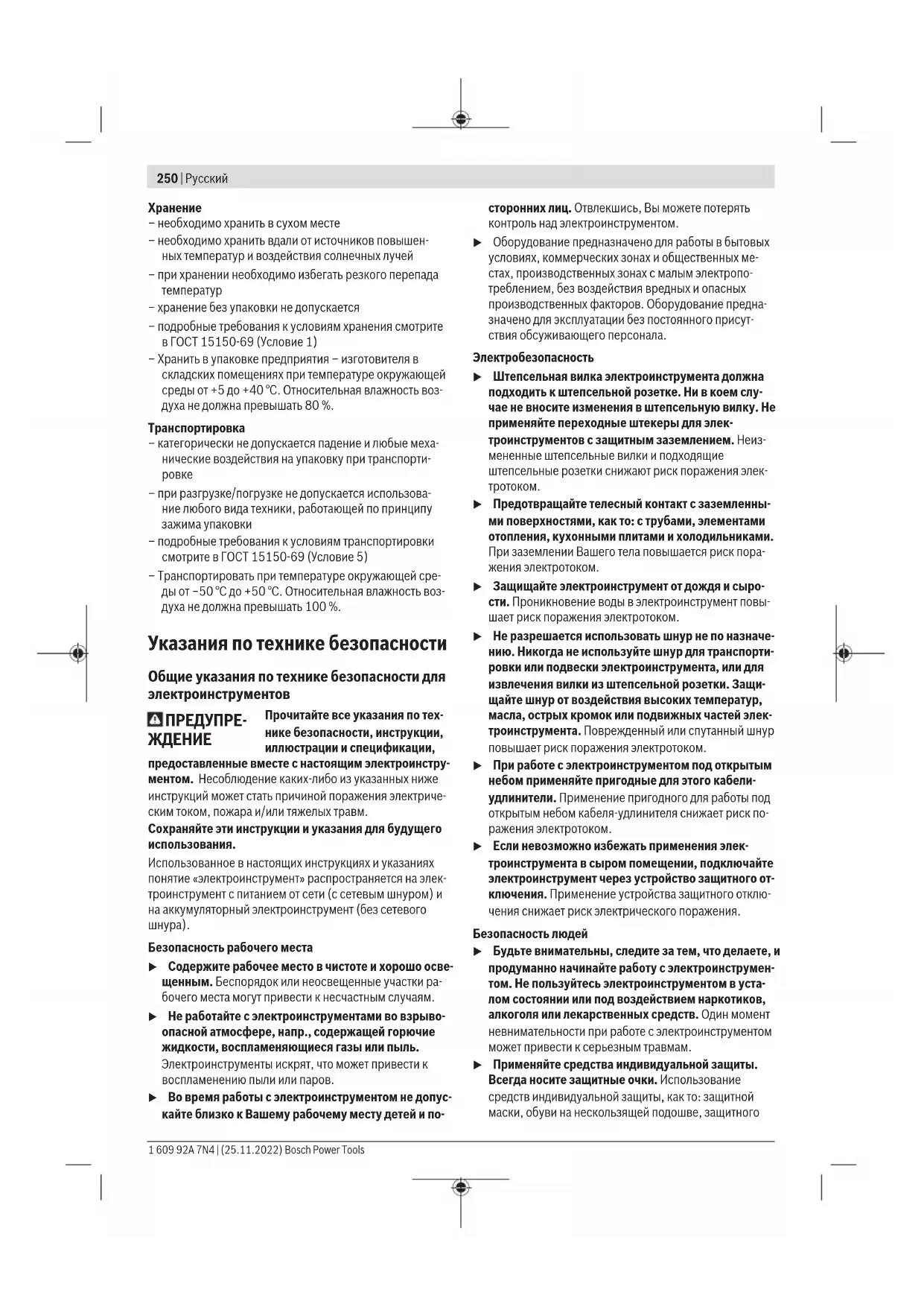 u Предотвращайте телесный контакт с заземленны- ми поверхностями, как то: с трубами, элементами отопления, кухонными плитами и холодильниками. При заземлении Вашего тела повышается риск пора- жения электротоком. u Защищайте электроинструмент от дождя и сыро- сти. Проникновение воды в электроинструмент повы- шает риск поражения электротоком. u Не разрешается использовать шнур не по назначе- нию. Никогда не используйте шнур для транспорти- ровки или подвески электроинструмента, или для извлечения вилки из штепсельной розетки. Защи- щайте шнур от воздействия высоких температур, масла, острых кромок или подвижных частей элек- троинструмента. Поврежденный или спутанный шнур повышает риск поражения электротоком. u При работе с электроинструментом под открытым небом применяйте пригодные для этого кабели- удлинители. Применение пригодного для работы под открытым небом кабеля-удлинителя снижает риск по- ражения электротоком. u Если невозможно избежать применения элек- троинструмента в сыром помещении, подключайте электроинструмент через устройство защитного от- ключения. Применение устройства защитного отклю- чения снижает риск электрического поражения. Безопасность людей u Будьте внимательны, следите за тем, что делаете, и продуманно начинайте работу с электроинструмен- том. Не пользуйтесь электроинструментом в уста- лом состоянии или под воздействием наркотиков, алкоголя или лекарственных средств. Один момент невнимательности при работе с электроинструментом может привести к серьезным травмам. u Применяйте средства индивидуальной защиты. Всегда носите защитные очки. Использование средств индивидуальной защиты, как то: защитной маски, обуви на нескользящей подошве, защитного 1 609 92A 7N4 | (25.11.2022) Bosch Power ToolsРусский | 251 шлема или средств защиты органов слуха, в зависимо- сти от вида работы с электроинструментом снижает риск получения травм. u Предотвращайте непреднамеренное включение электроинструмента. Перед тем как подключить электроинструмент к сети и/или к аккумулятору, поднять или переносить электроинструмент, убе- дитесь, что он выключен. Удержание пальца на вы- ключателе при транспортировке электроинструмента и подключение к сети питания включенного элек- троинструмента чревато несчастными случаями. u Убирайте установочный инструмент или гаечные ключи до включения электроинструмента. Инстру- мент или ключ, находящийся во вращающейся части электроинструмента, может привести к травмам. u Не принимайте неестественное положение корпуса тела. Всегда занимайте устойчивое положение и сохраняйте равновесие. Благодаря этому Вы можете лучше контролировать электроинструмент в неожи- данных ситуациях. u Носите подходящую рабочую одежду. Не носите широкую одежду и украшения. Держите волосы и одежду вдали от подвижных деталей. Широкая оде- жда, украшения или длинные волосы могут быть за- тянуты вращающимися частями. u При наличии возможности установки пылеотсасы- вающих и пылесборных устройств проверяйте их присоединение и правильное использование. При- менение пылеотсоса может снизить опасность, созда- ваемую пылью. u Хорошее знание электроинструментов, полученное в результате частого их использования, не должно приводить к самоуверенности и игнорированию техники безопасности обращения с электроинстру- ментами. Одно не