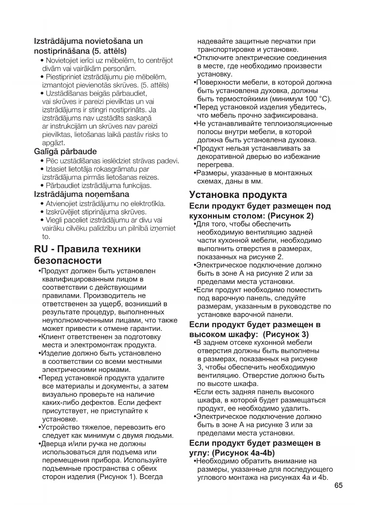 - Электрическое подключение должно быть в зоне A на рисунке 3 или за пределами места установки. Если продукт будет размещен в углу: (Рисунок 4a-4b)