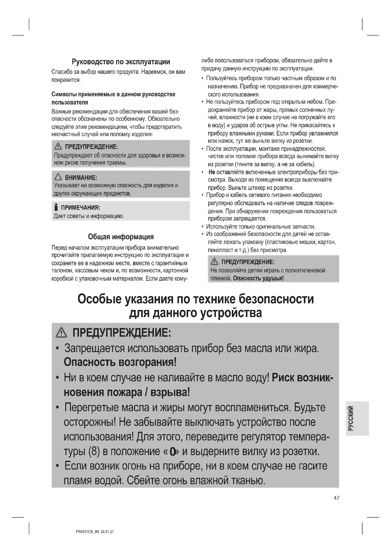 - Если возник огонь на приборе, ни в коем случае не гасите пламя водой. Сбейте огонь влажной тканью.FR6051CB_IM 26.01.21