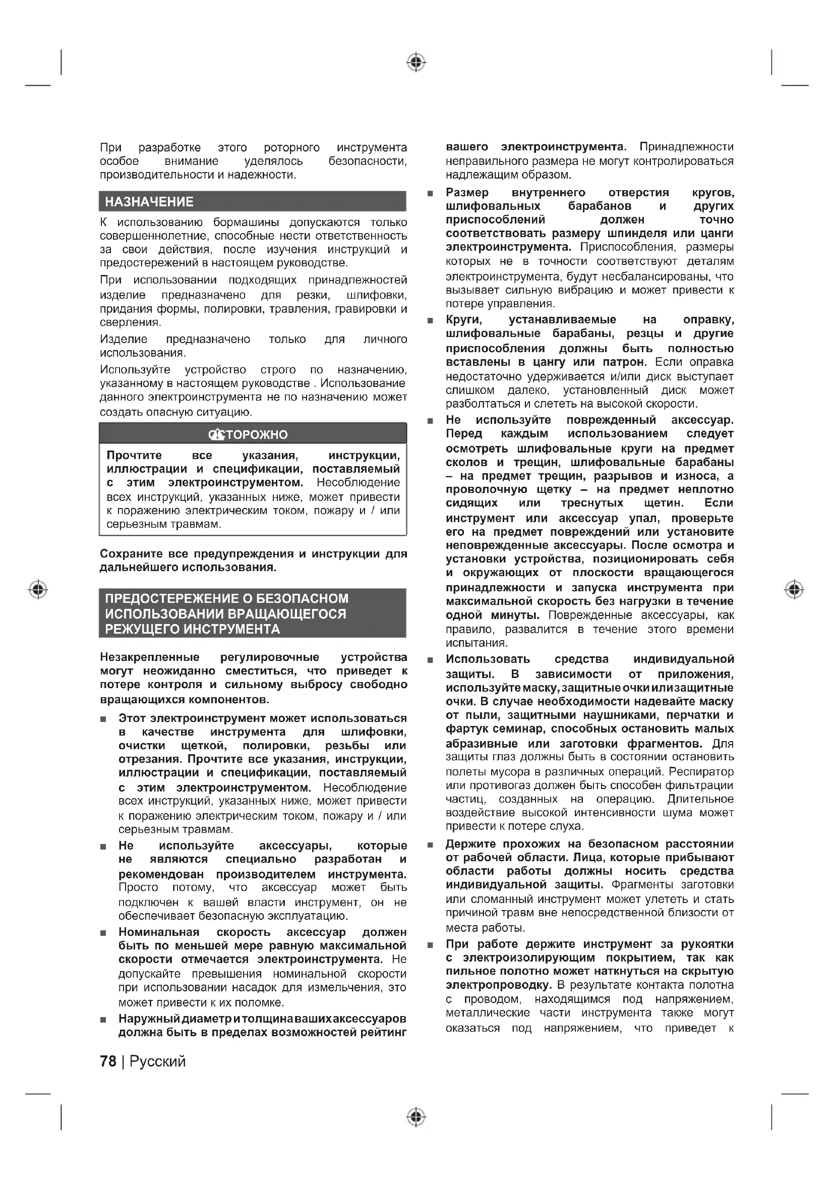 Прочтите все указания, инструкции, иллюстрации и спецификации, поставляемый с этим электроинструментом. Несоблюдение всех инструкций, указанных ниже, может привести к поражению электрическим током, пожару и / или серьезным травмам. Сохраните все предупреждения и инструкции для дальнейшего использования. ПРЕДОСТЕРЕЖЕНИЕ О БЕЗОПАСНОМ ИСПОЛЬЗОВАНИИ ВРАЩАЮЩЕГОСЯ РЕЖУЩЕГО ИНСТРУМЕНТА Незакрепленные регулировочные устройства могут неожиданно сместиться, что приведет к потере контроля и сильному выбросу свободно вращающихся компонентов. ■ Этот электроинструмент может использоваться в качестве инструмента для шлифовки, очистки щеткой, полировки, резьбы или отрезания. Прочтите все указания, инструкции, иллюстрации и спецификации, поставляемый с этим электроинструментом. Несоблюдение всех инструкций, указанных ниже, может привести к поражению электрическим током, пожару и / или серьезным травмам. ■ Не используйте аксессуары, которые не являются специально разработан и рекомендован производителем инструмента. Просто потому, что аксессуар может быть подключен к вашей власти инструмент, он не обеспечивает безопасную эксплуатацию. ■ Номинальная скорость аксессуар должен быть по меньшей мере равную максимальной скорости отмечается электроинструмента. Не допускайте превышения номинальной скорости при использовании насадок для измельчения, это может привести к их поломке. ■ Наружный диаметр и толщина ваших аксессуаров должна быть в пределах возможностей рейтинг вашего электроинструмента. Принадлежности неправильного размера не могут контролироваться надлежащим образом. ■ Размер внутреннего отверстия кругов, шлифовальных барабанов и других приспособлений должен точно соответствовать размеру шпинделя или цанги электроинструмента. Приспособления, размеры которых не в точности соответствуют деталям электроинструмента, будут несбалансированы, что вызывает сильную вибрацию и может привести к потере управления. ■ Круги, устанавливаемые на оправку, шлифовальные барабаны, резцы и другие приспособления должны быть полностью вставлены в цангу или патрон. Если оправка недостаточно удерживается и/или диск выступает слишком далеко, установленный диск может разболтаться и слететь на высокой скорости. ■ Не используйте поврежденный аксессуар. Перед каждым использованием следует осмотреть шлифовальные круги на предмет сколов и трещин, шлифовальные барабаны – на предмет трещин, разрывов и износа, а проволочную щетку – на предмет неплотно сидящих или треснутых щетин. Если инструмент или аксессуар упал, проверьте его на предмет повреждений или установите неповрежденные аксессуары. После осмотра