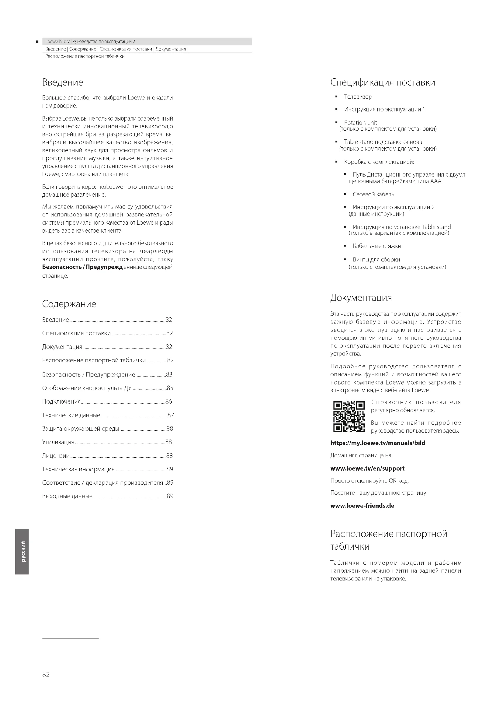 Инструкция по эксплуатации 1 Rotation unit (только c комплектом для установки) Table stand подставка-основа (только c комплектом для установки) Коробка c комплектацией: Пуль Дистанционного управления с двумя щелочными батарейками типа AAA Сетевой кабель Инструкции по эксплуатации 2 (данные инструкции) Инструкция по установке Table stand (только в вариантах с комплектацией) Кабельные стяжки Винты для сборки (только с комплектом для установки) Документация Эта часть руководства по эксплуатации содержит важную базовую информацию. Устройство вводится в эксплуатацию и настраивается с помощью интуитивно понятного руководства по эксплуатации после первого включения устройства. Подробное руководство пользователя с описанием функций и возможностей вашего нового комплекта Loewe можно загрузить в электронном виде с веб-сайта Loewe. Справочник пользователя регулярно обновляется. Вы можете найти подробное руководство пользователя здесь: https://my.loewe.tv/manuals/bild Домашняя страница на: www.loewe.tv/en/support Просто отсканируйте QR-код. Посетите нашу домашнюю страницу: www.loewe-friends.de Расположение паспортной