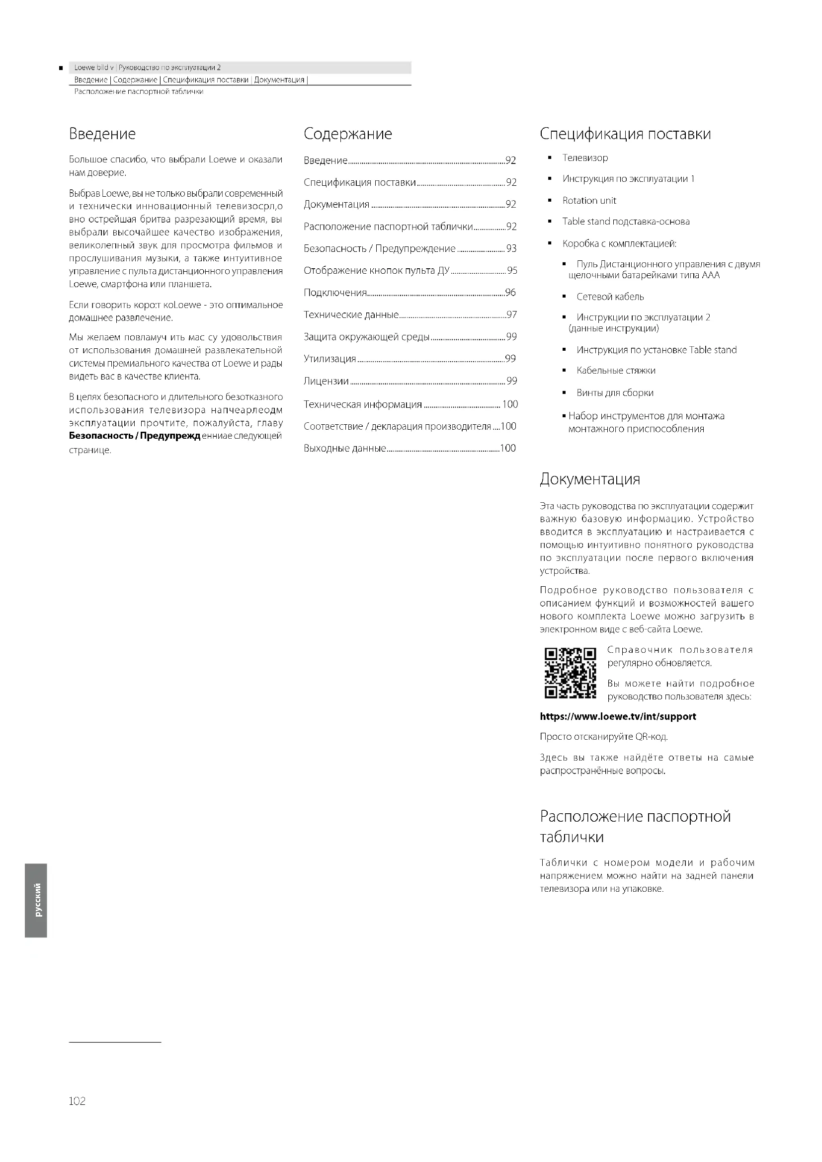 Набор инструментов для монтажа монтажного приспособления Документация Эта часть руководства по эксплуатации содержит важную базовую информацию. Устройство вводится в эксплуатацию и настраивается с помощью интуитивно понятного руководства по эксплуатации после первого включения устройства. Подробное руководство пользователя с описанием функций и возможностей вашего нового комплекта Loewe можно загрузить в электронном виде с веб-сайта Loewe. Справочник пользователя регулярно обновляется. Вы можете найти подробное руководство пользователя здесь: https://www.loewe.tv/int/support Просто отсканируйте QR-код. Здесь вы также найдёте ответы на самые распространённые вопросы. Расположение паспортной