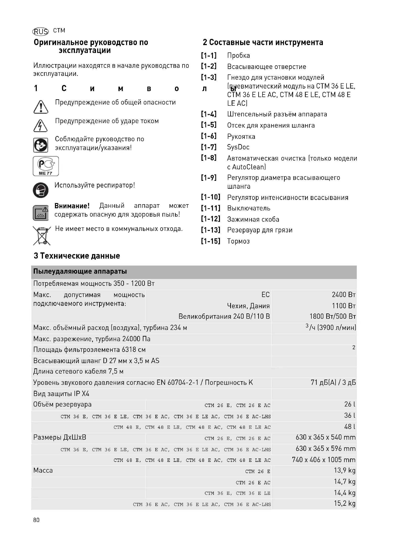 Aspirador móvel N.º de série80 CTM RUS Оригинальное руководство по эксплуатации Иллюстрации находятся в начале руководства по эксплуатации. 1Символы 2 Составные части инструмента 3 Технические данные Предупреждение об общей опасности Предупреждение об ударе током Соблюдайте руководство по эксплуатации/указания! Используйте респиратор!
