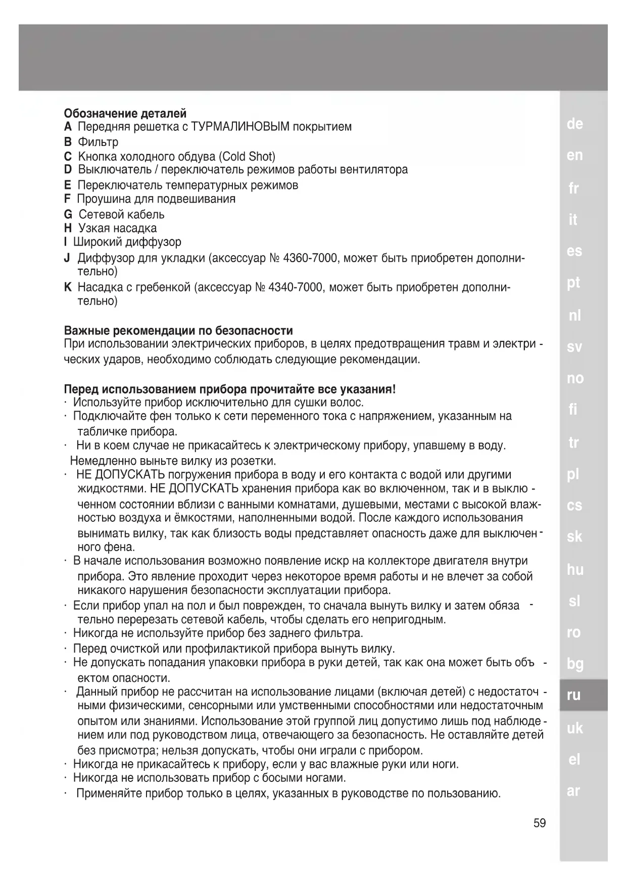 Обозначение деталей A Передняя решетка с ТУРМАЛИНОВЫМ покрытием B Фильтр C Кнопка холодного обдува (Cold Shot) D Выключатель / переключатель режимов работы вентилятора E Переключатель температурных режимов F Проушина для подвешивания G Сетевой кабель H Узкая насадка I Широкий диффузор J Диффузор для укладки (аксессуар № 4360-7000, может быть приобретен дополни-