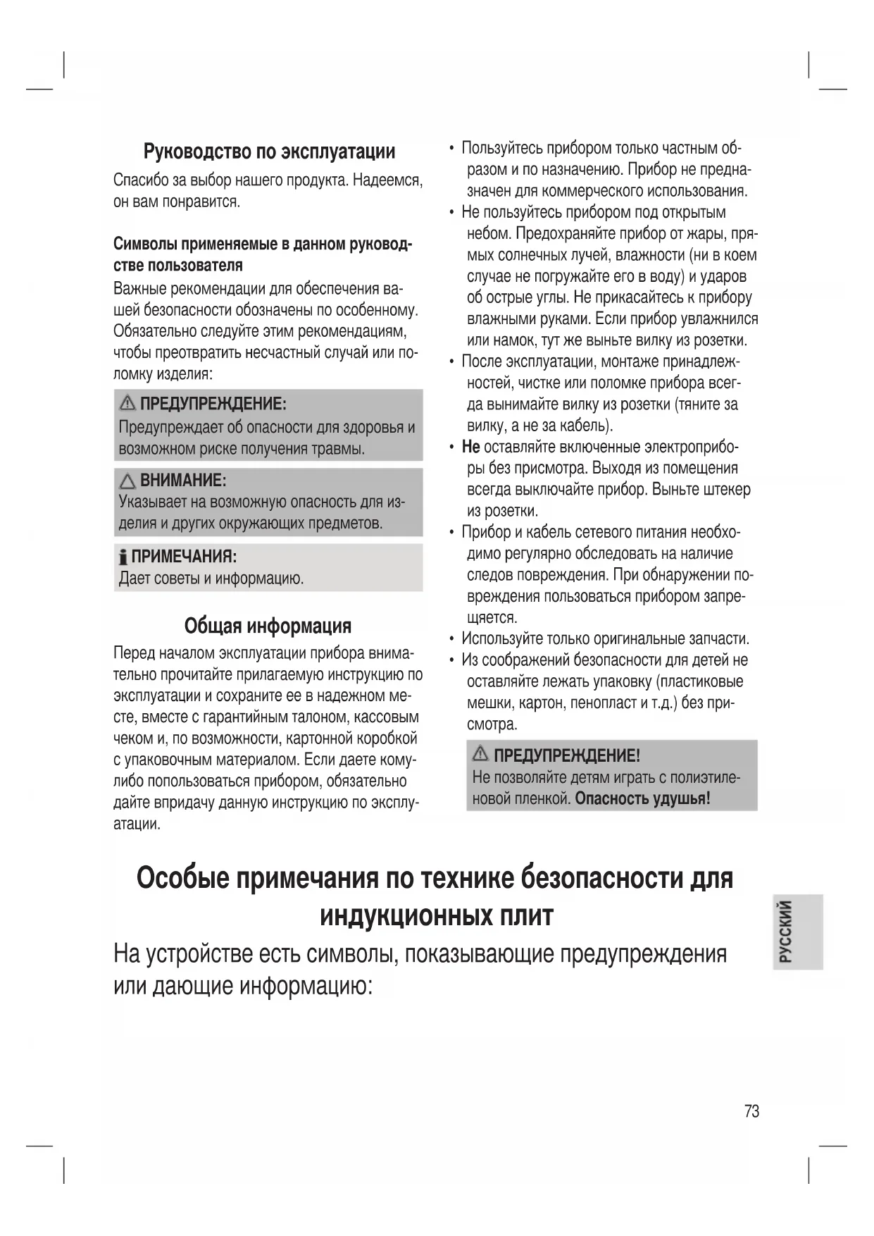 ПРЕДУПРЕЖДЕНИЕ! Не позволяйте детям играть с полиэтиле- новой пленкой. Опасность удушья! Особые примечания по технике безопасности для индукционных плит На устройстве есть символы, показывающие предупреждения или дающие информацию:74 ПРЕДУПРЕЖДЕНИЕ: Горячая поверхность! Опасность ожога! Во время работы устройства температура открытых поверхно- стей может быть очень высокой. ПРЕДУПРЕЖДЕНИЕ: