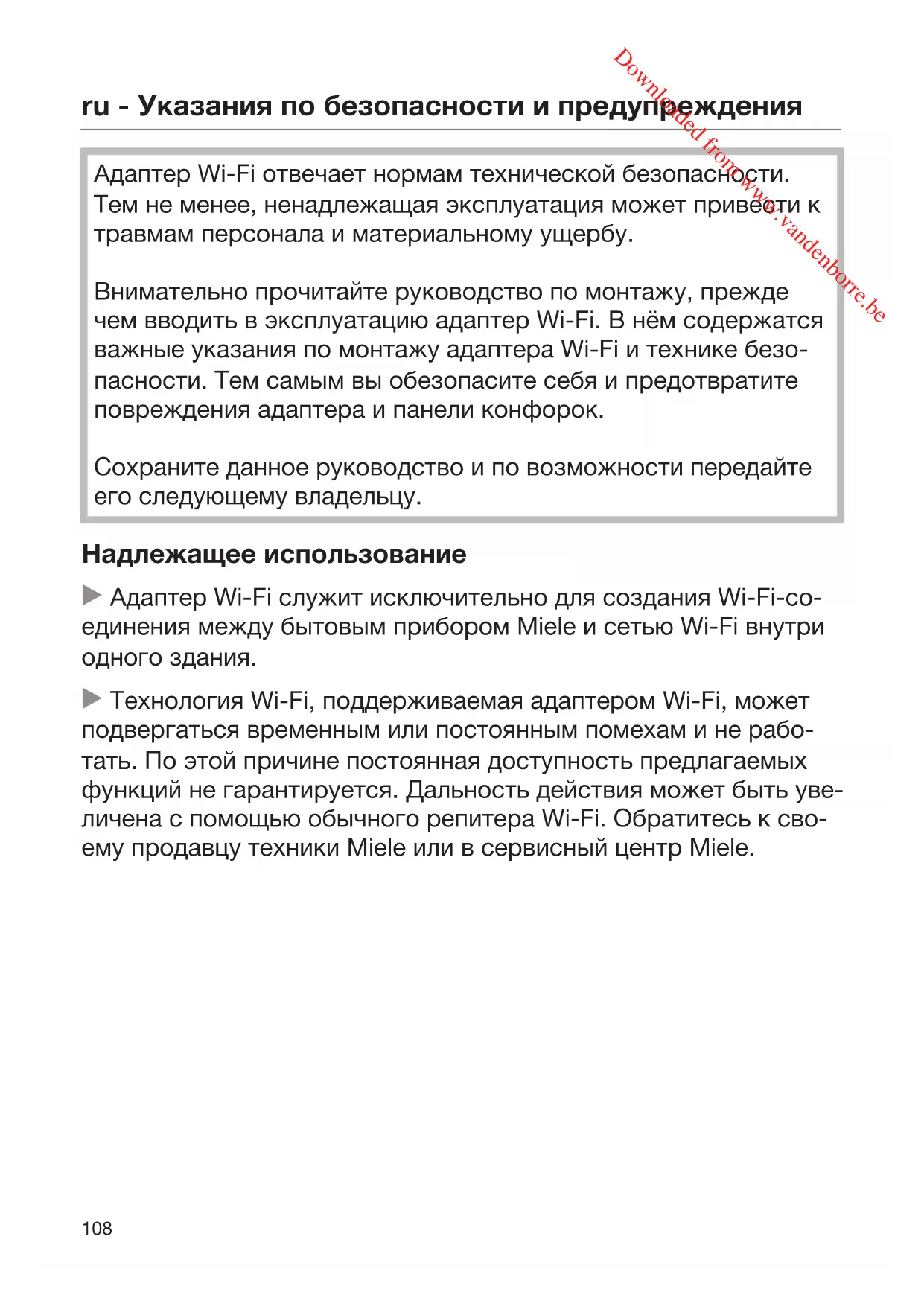 Адаптер Wi-Fi отвечает нормам технической безопасности. Тем не менее, ненадлежащая эксплуатация может привести к травмам персонала и материальному ущербу. Внимательно прочитайте руководство по монтажу, прежде чем вводить в эксплуатацию адаптер Wi-Fi. В нём содержатся важные указания по монтажу адаптера Wi-Fi и технике безо- пасности. Тем самым вы обезопасите себя и предотвратите повреждения адаптера и панели конфорок. Сохраните данное руководство и по возможности передайте его следующему владельцу. Надлежащее использование Адаптер Wi-Fi служит исключительно для создания Wi-Fi-со- единения между бытовым прибором Miele и сетью Wi-Fi внутри одного здания. Технология Wi-Fi, поддерживаемая адаптером Wi-Fi, может подвергаться временным или постоянным помехам и не рабо- тать. По этой причине постоянная доступность предлагаемых функций не гарантируется. Дальность действия может быть уве- личена с помощью обычного репитера Wi-Fi. Обратитесь к сво- ему продавцу техники Miele или в сервисный центр Miele. Downloaded from www.vandenborre.beru - Указания по безопасности и предупреждения