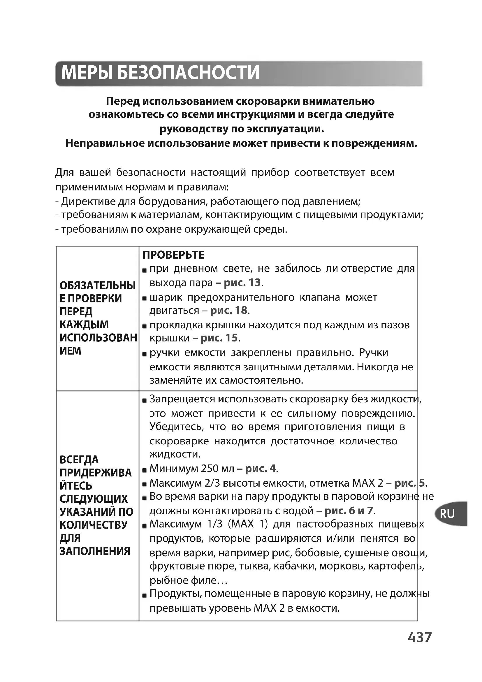 Перед использованием скороварки внимательно ознакомьтесь со всеми инструкциями и всегда следуйте руководству по эксплуатации. Неправильное использование может привести к повреждениям. Для вашей безопасности настоящий прибор соответствует всем применимым нормам и правилам: - Директиве для борудования, работающего под давлением; - требованиям к материалам, контактирующим с пищевыми продуктами; - требованиям по охране окружающей среды. МЕРЫ БЕЗОПАСНОСТИ ОБЯЗАТЕЛЬНЫ