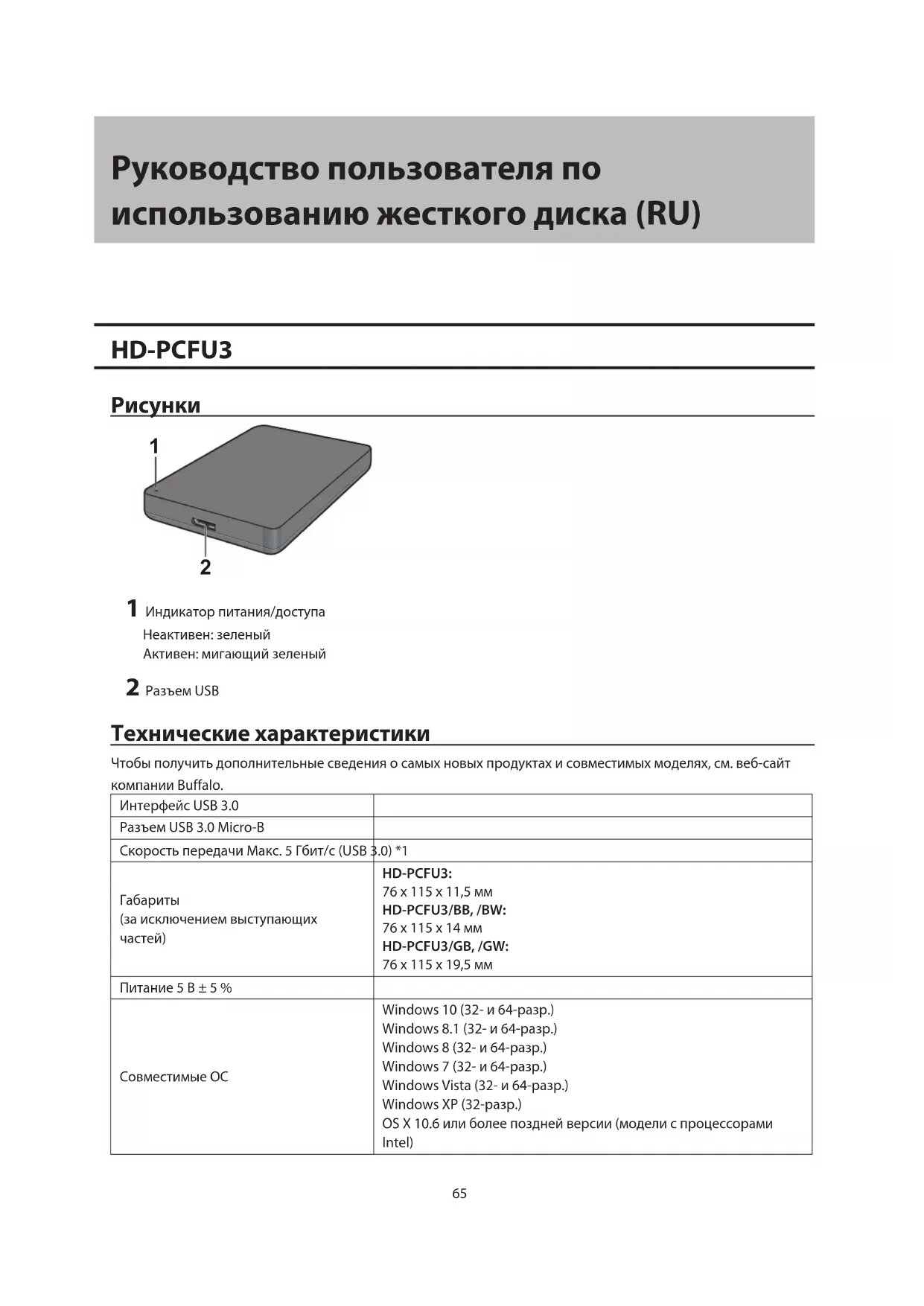 1 Индикатор питания/доступа Неактивен: зеленый Активен: мигающий зеленый 2 Разъем USB Технические характеристики Чтобы получить дополнительные сведения о самых новых продуктах и совместимых моделях, см. веб-сайт компании Buffalo. Интерфейс USB 3.0 Разъем USB 3.0 Micro-B Скорость передачи Макс. 5 Гбит/с (USB 3.0) *1
